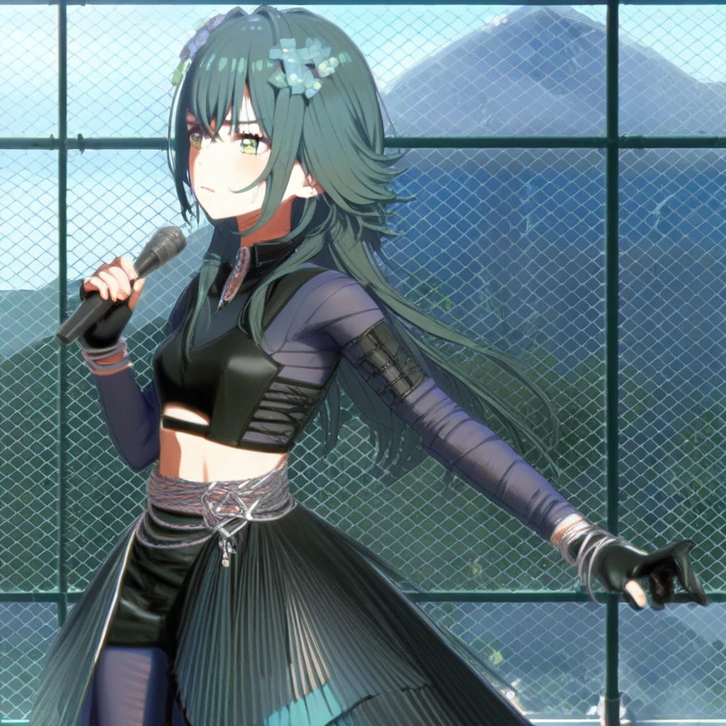 tsukimura_temari, tsukimura_temari_sr_outfit, 1girl, belt, black choker, black hair, bush, earrings, hairy, heart choker, jacket, leotard under clothes, long hair, long sleeves, navel, silk, solo, spiked_neck_ring, pleated skirt, skirt, solo, white skirt, white_pants, see-through,