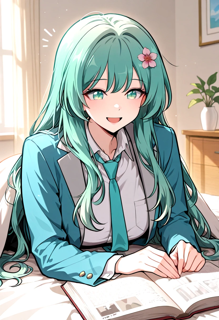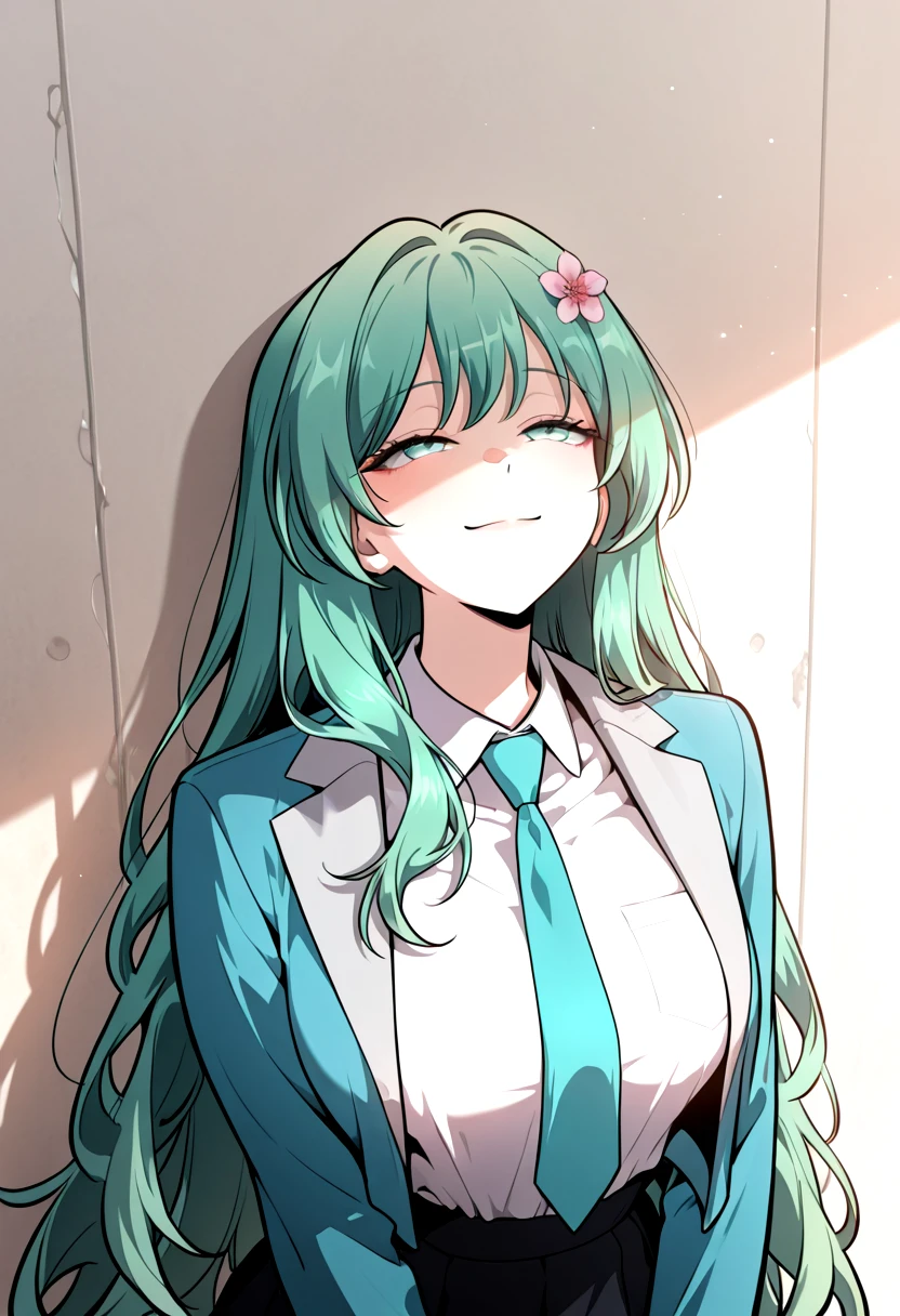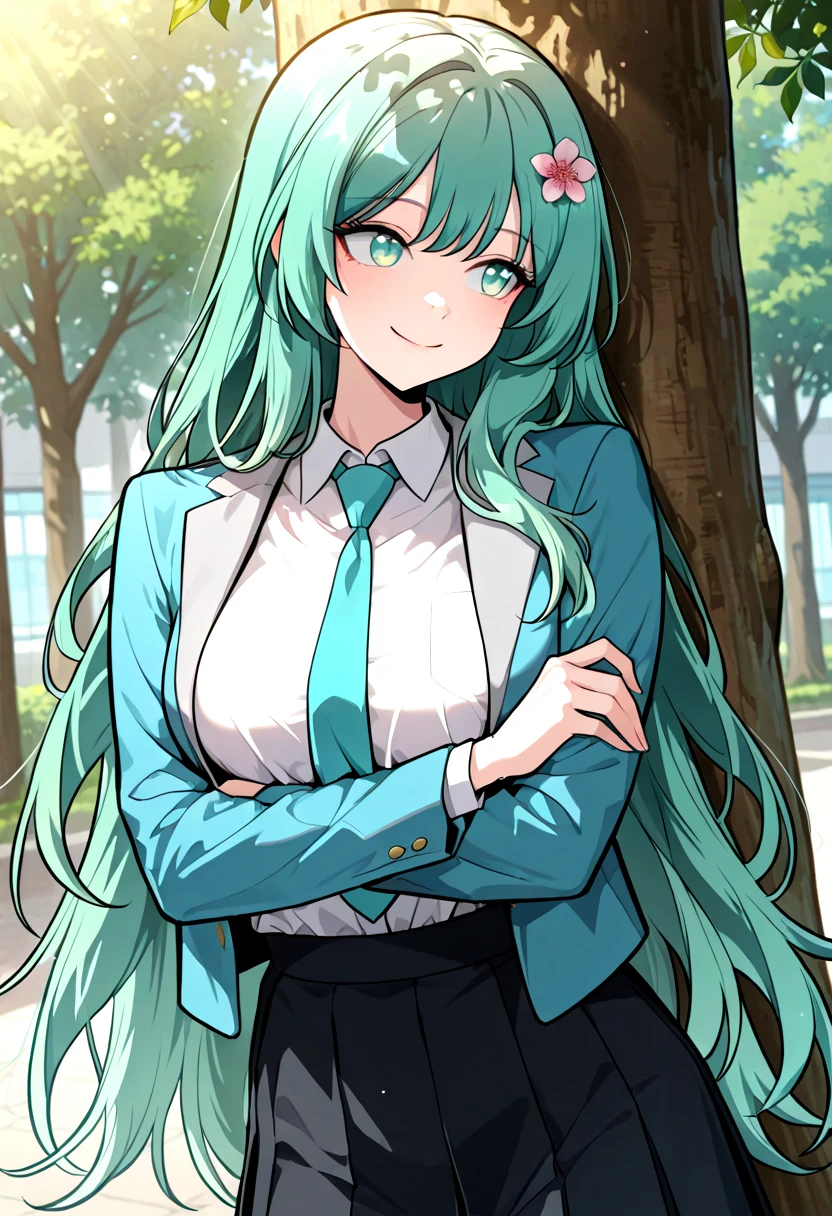 Yu Bom,school uniform,blue necktie,long sleeves,Aqua eyes,aqua hair,black skirt,skirt,very long hair,blue jacket,Open jacket,aqua necktie,green eyes,collared shirt,green hair,jacket,long hair,necktie,shirt,white shirt,(hair ornament,hair flower,:0.8),