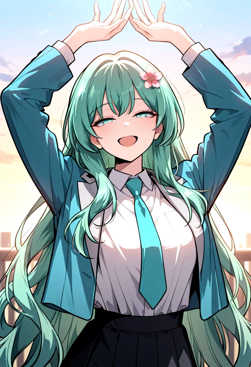 Yu Bom,school uniform,blue necktie,long sleeves,Aqua eyes,aqua hair,black skirt,skirt,very long hair,blue jacket,Open jacket,aqua necktie,green eyes,collared shirt,green hair,jacket,long hair,necktie,shirt,white shirt,(hair ornament,hair flower,:0.8),0.85~1.1