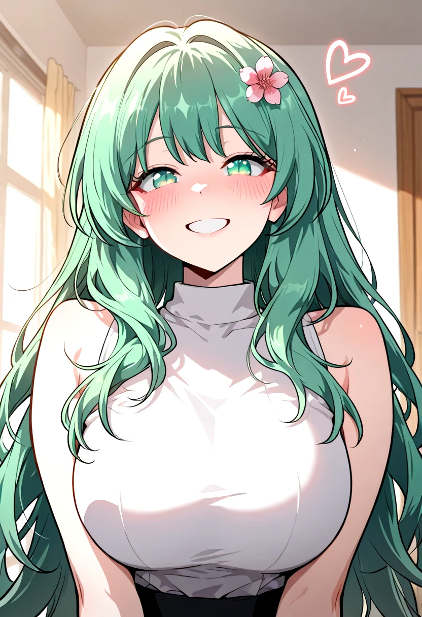 yu bom, long hair, green hair, green eyes, (hair flower ,hair ornament:0.8 ),large breasts,Ponytail