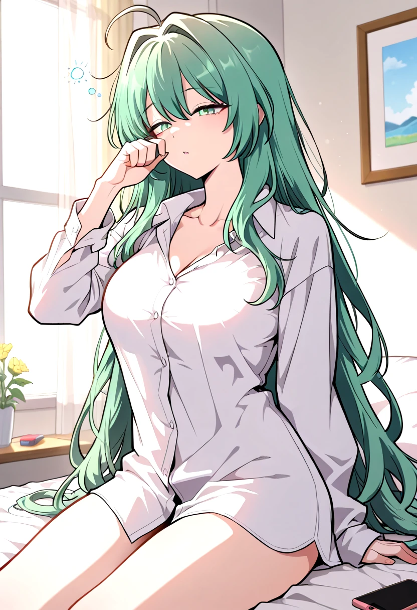 Yu Bom,collarbone ,collared shirt ,dress shirt ,hair between eyes ,hair intakes,long sleeves ,,very long hair ,waking up ,ahoge,green eyes ,green hair ,long hair,shirt ,white shirt ,,waking up,sleepy
