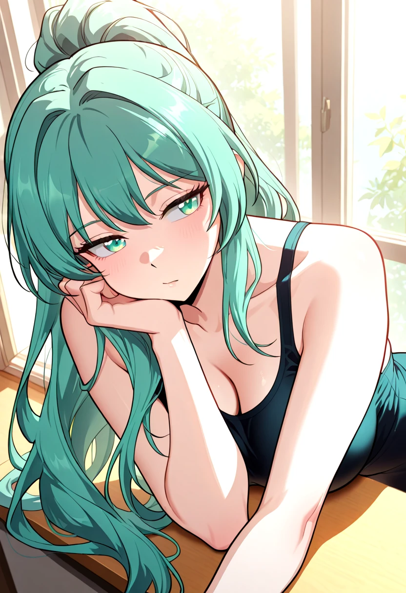 Yu Bom,green hair,long hair,ponytail,aqua eyes,,very long hair,aqua hair,green eyes,