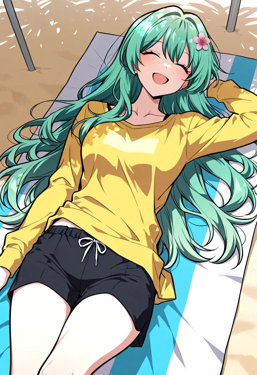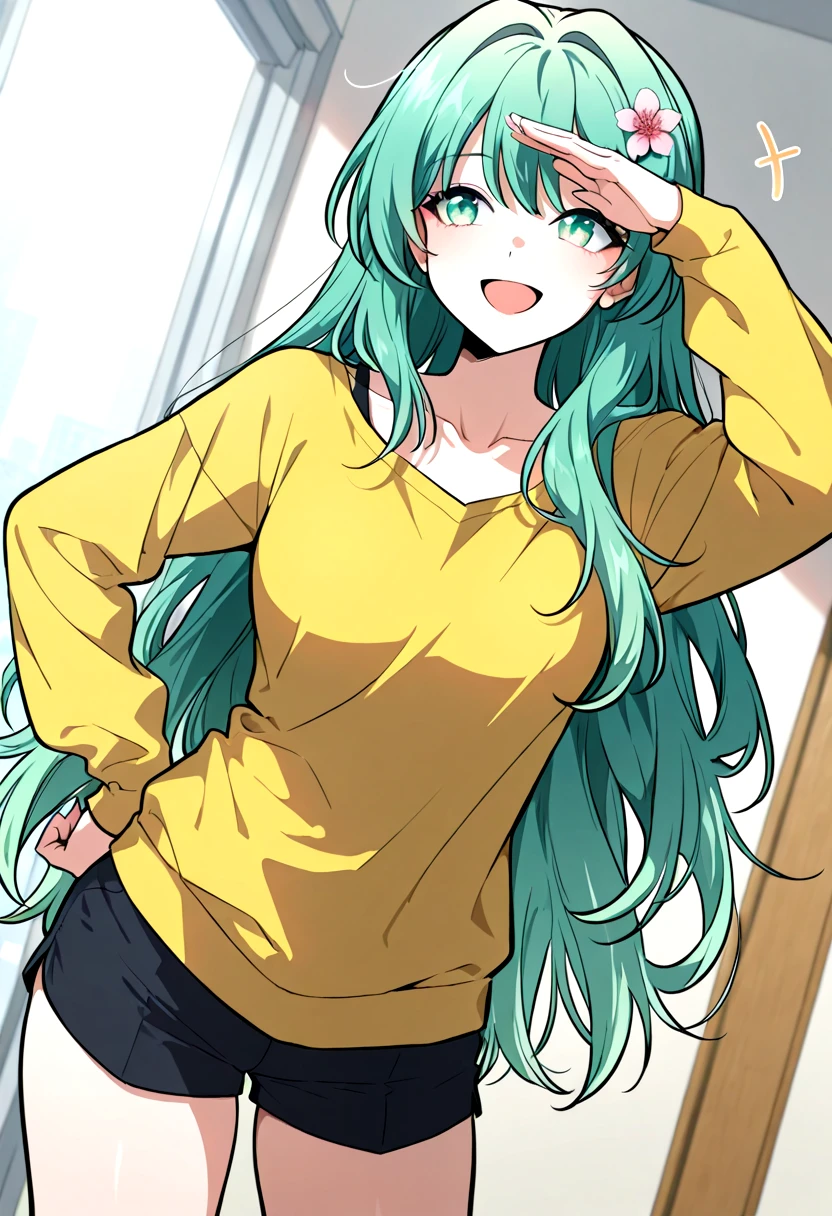 Yu Bomg,aqua hair,long hair,green hair,Yu Bomg,reen eyes,collarbone,shorts,very long hair,long sleeves,(hair flower,hair ornament:0.8),yellow shirt,shirt,Black shorts,