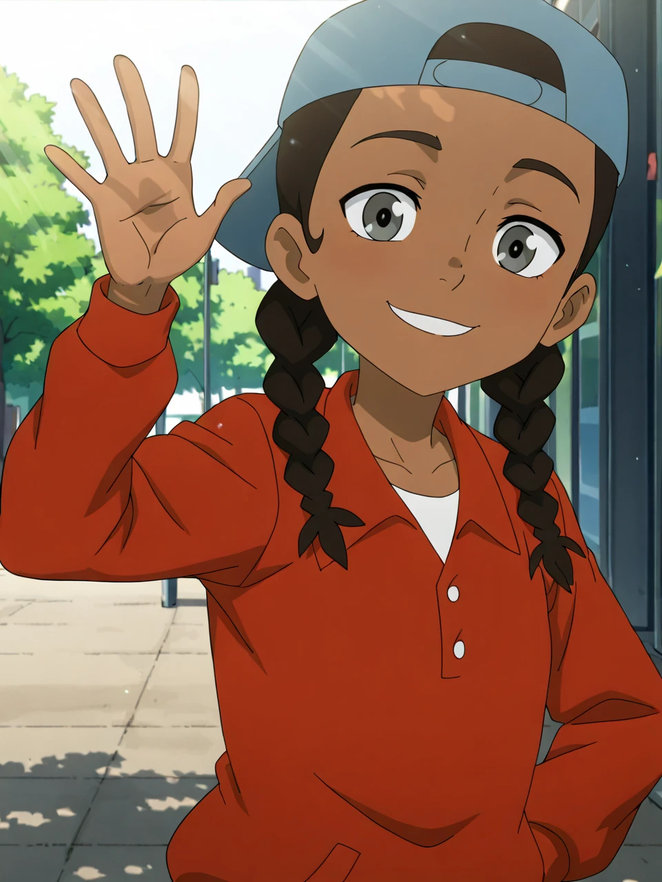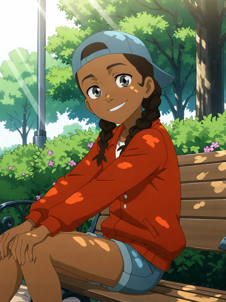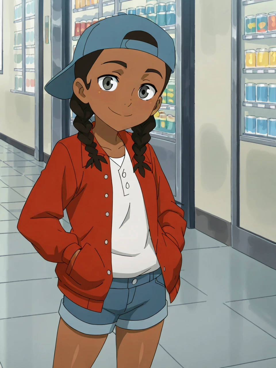 Fl1p, 1girl, solo, black hair, twin braids, dark-skinned female, grey eyes, baseball cap, red jacket, blue headwear, backwards hat, denim shorts,