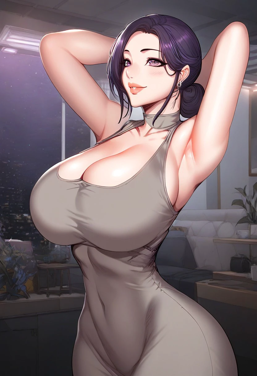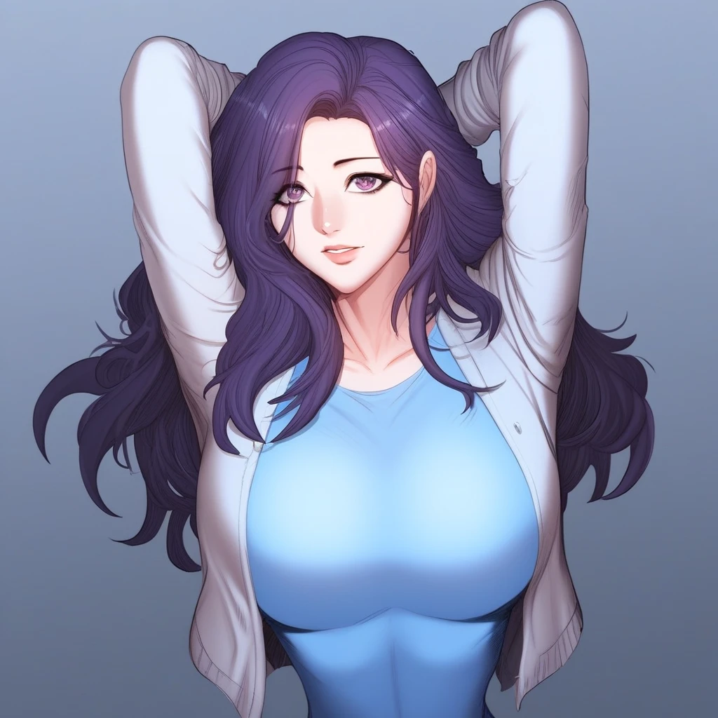 (( <lora:oh_choon-hwa:1> , oh_choon-hwa, thin waist, wide hips, beautiful skin, piercing purple eyes, clear eyes, bright pupils, beautiful eyes, beautiful purple hair, huge and shaggy breasts, natural beauty, extraordinary beautiful woman, attractive woman, super sexy woman, lustful body, sexy woman with seductive obscene body, sensual body, voluptuous body, sexy beauty, no piercings, no piercing, ))