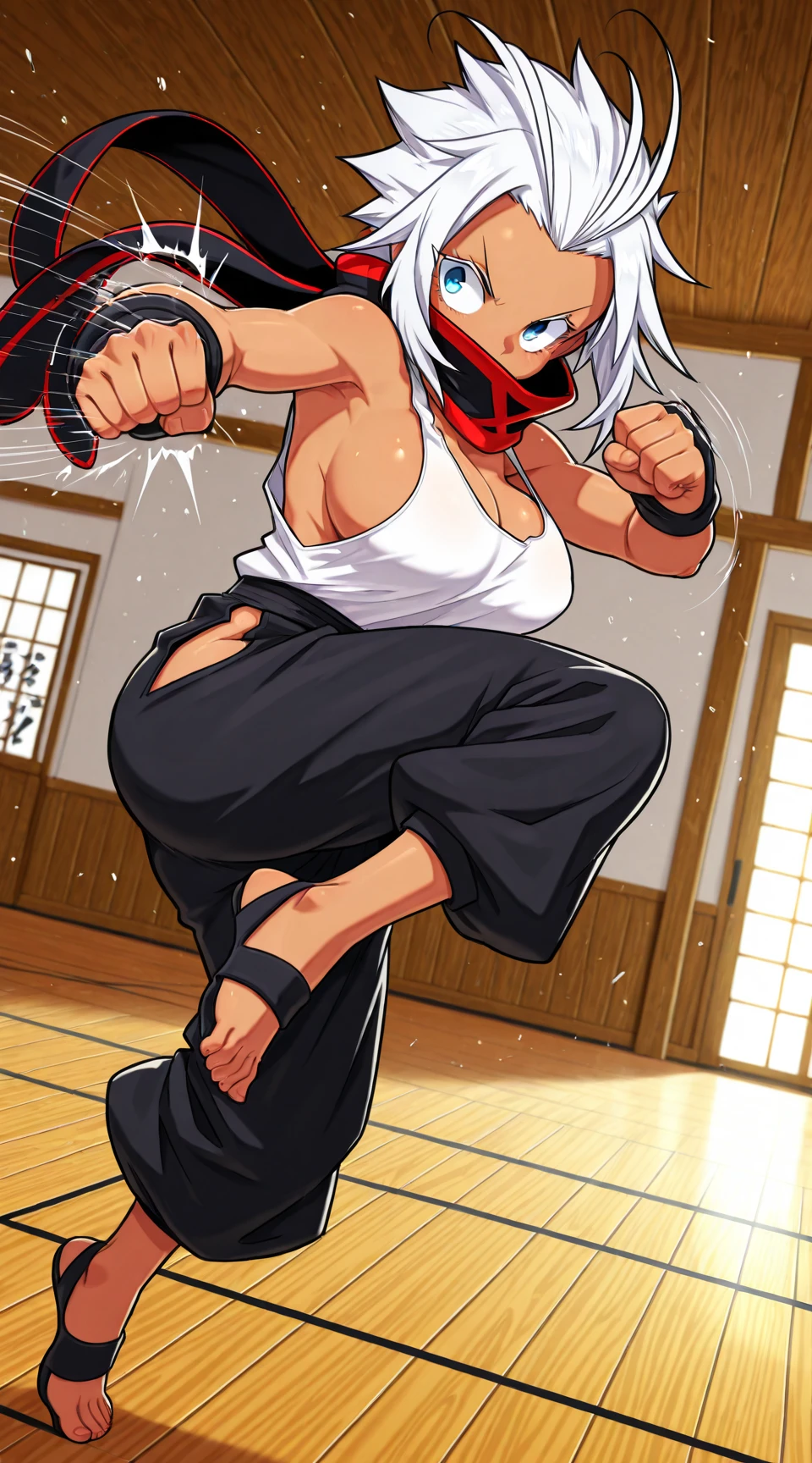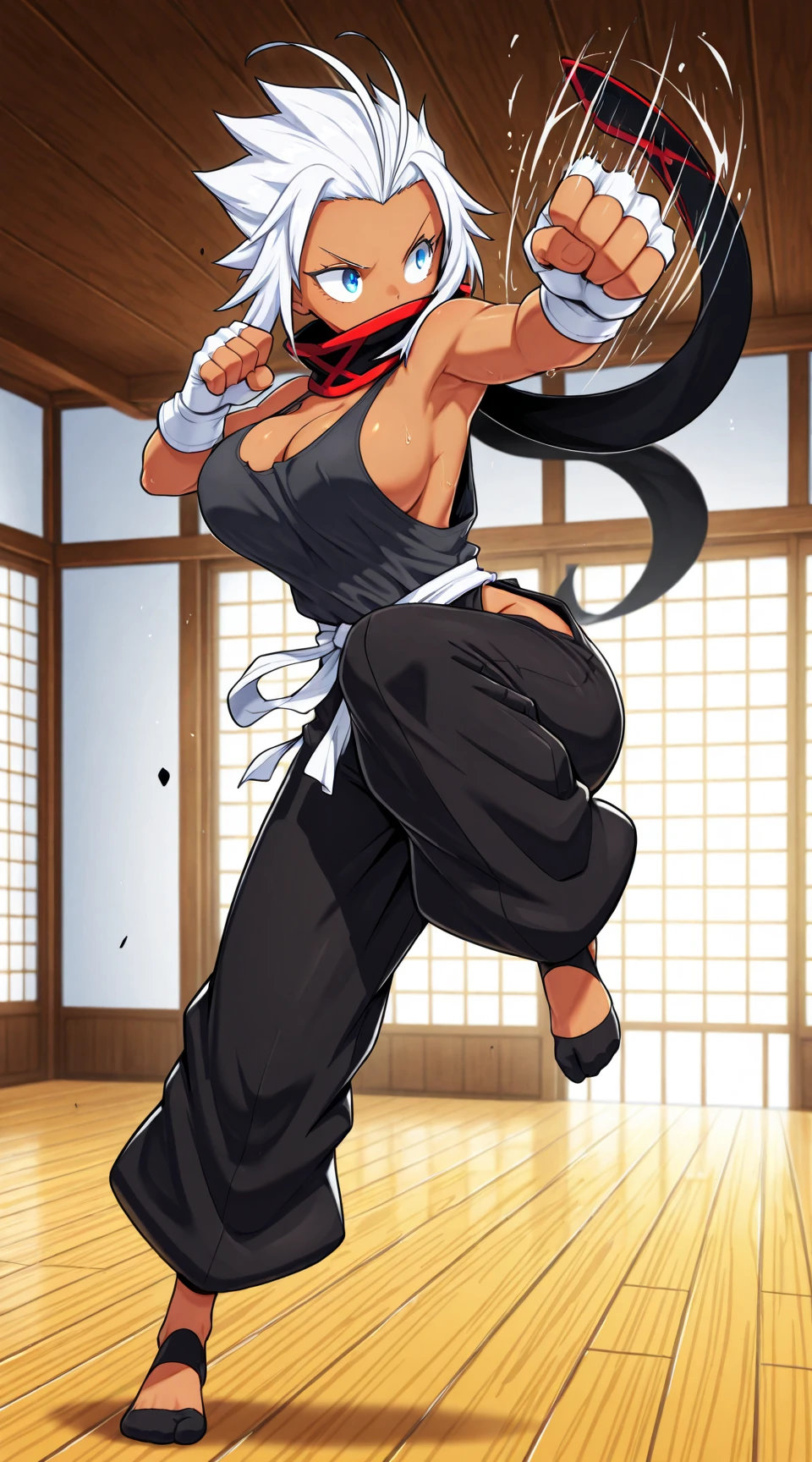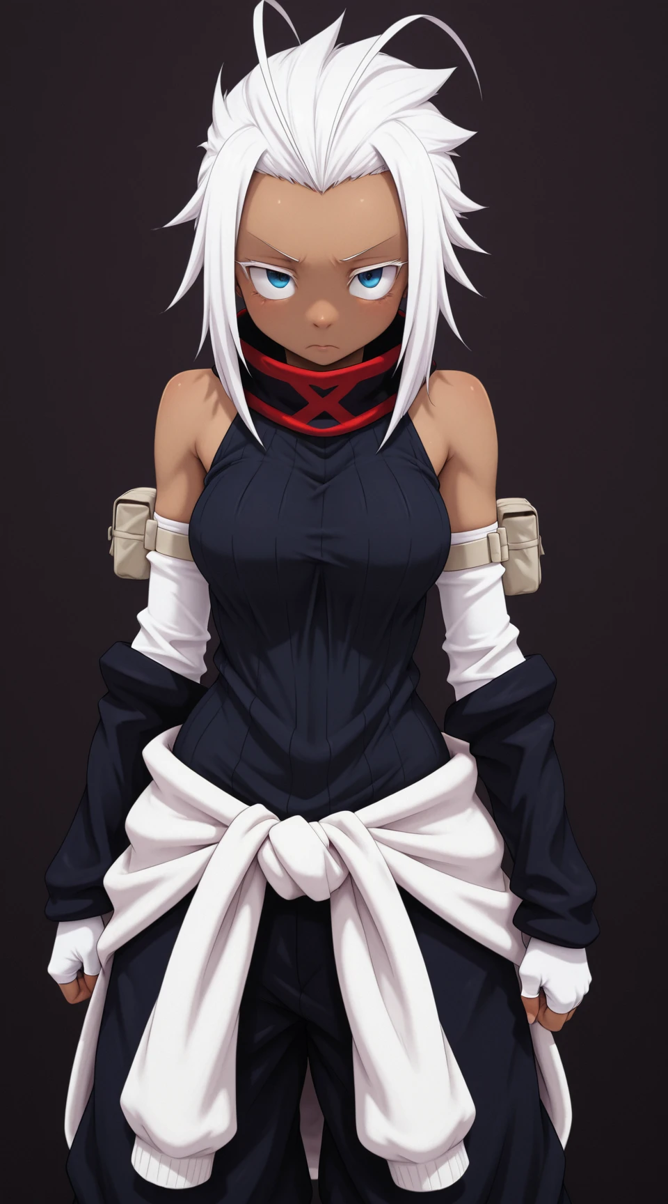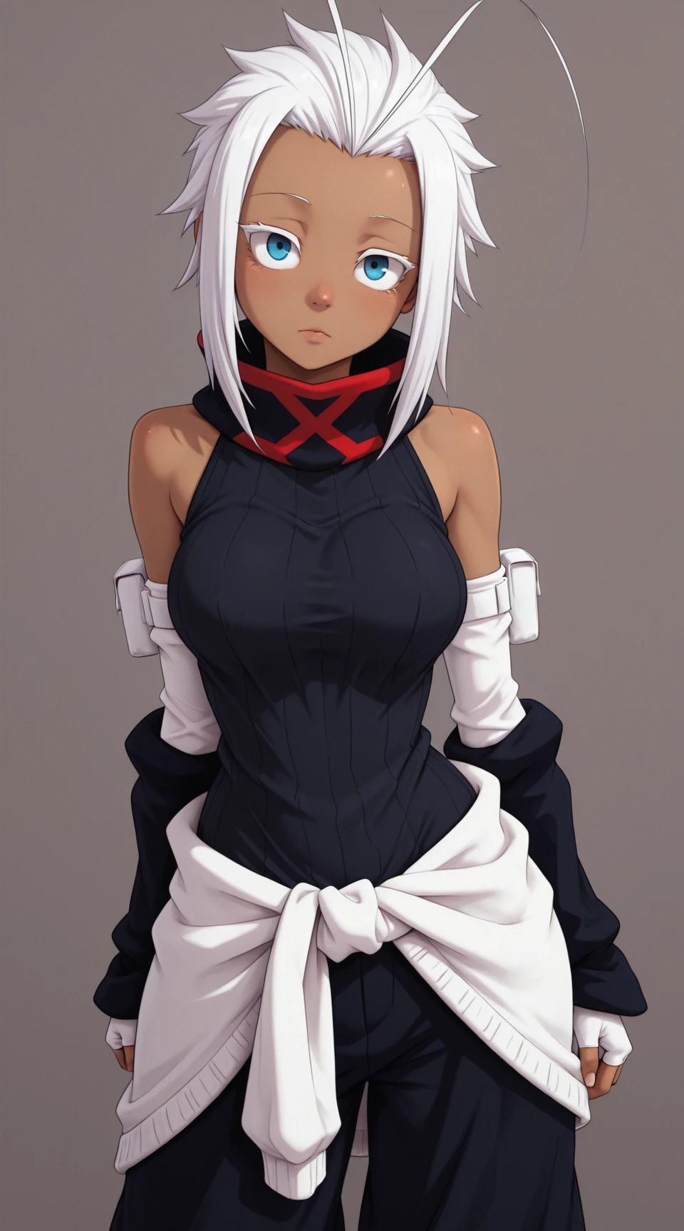Example prompt for her classic look: ggchan, scarf, black sleeveless_turtleneck, white_sweater_around_waist, white arm_pouch, black_arm_warmers, white_fingerless_elbow_gloves, black baggy_pants, bare_shoulders, solo