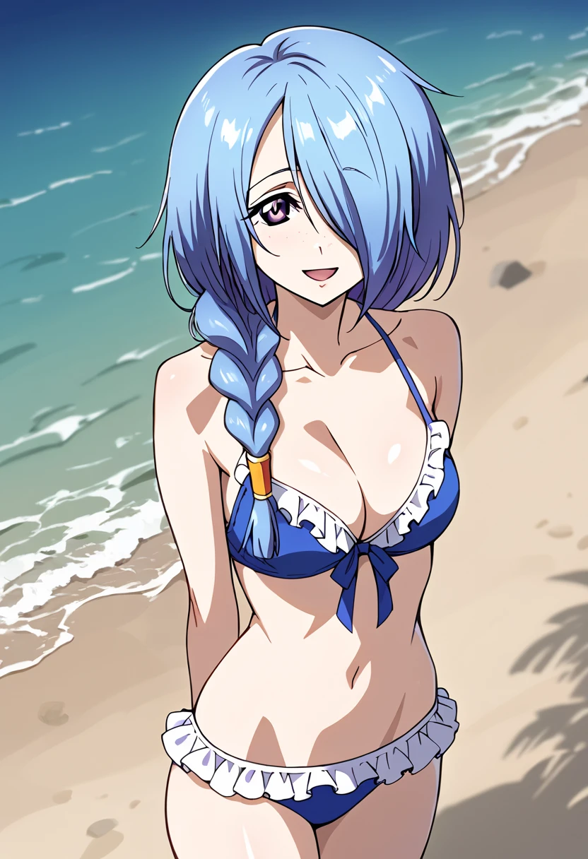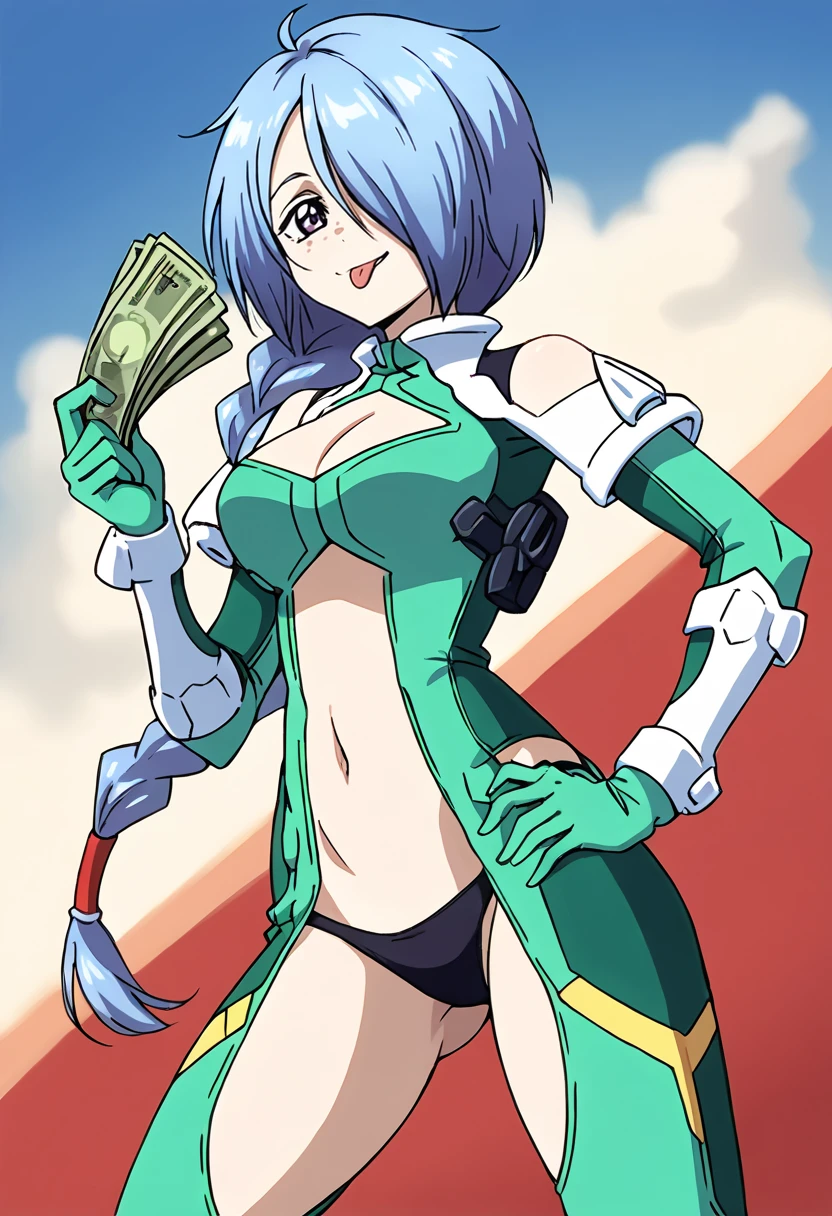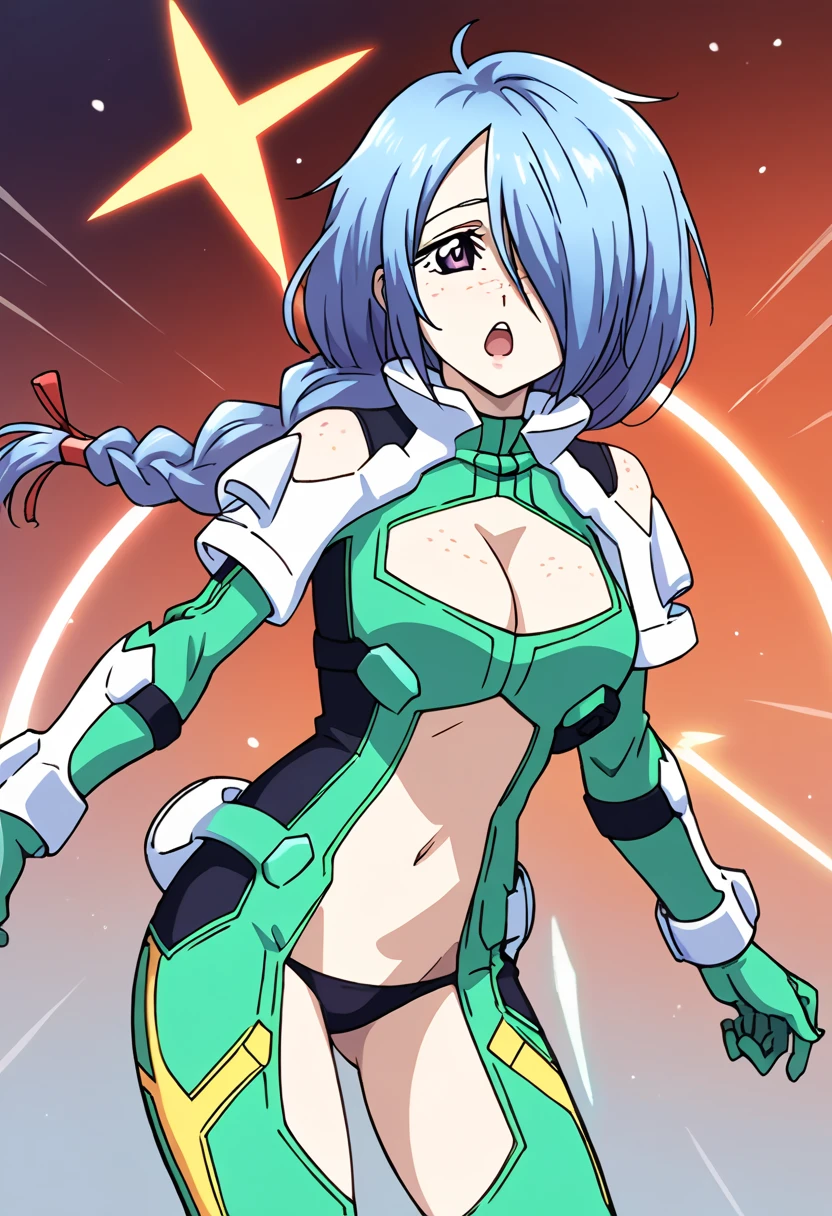 green bodysuit, detached sleeves, green gloves, cleavage cutout, navel cutout, black panties, bare thighs, blue hair, hair over one eye, long hair, single braid, face freckles, purple eyes