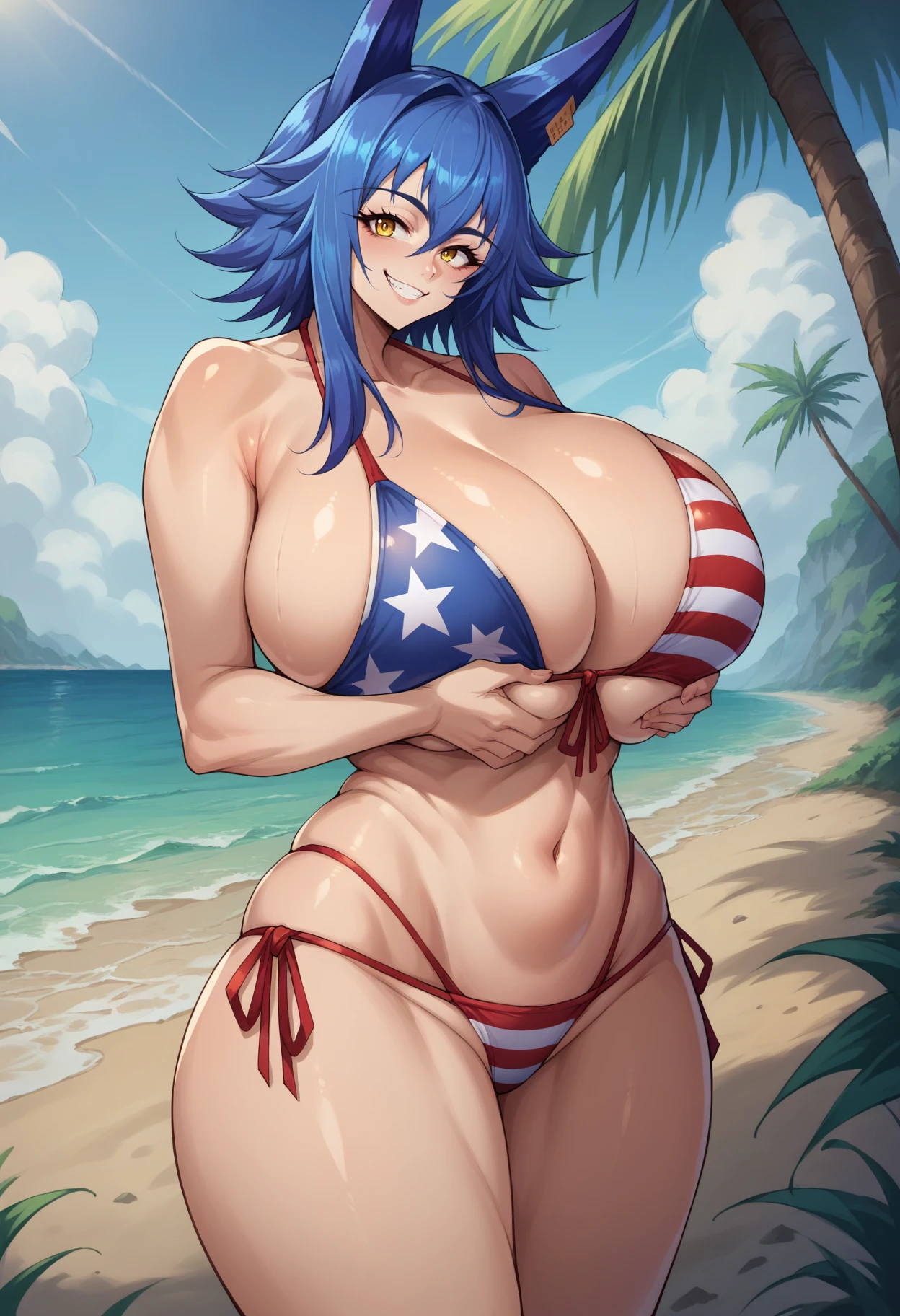 jelokn, huge breasts, blue hair, wolf ears, yellow eyes, medium hair, shrug \(clothing\), elbow gloves, black bikini, highleg panties, pantyhose, clothing cutout, inner thigh vent, wolf tail