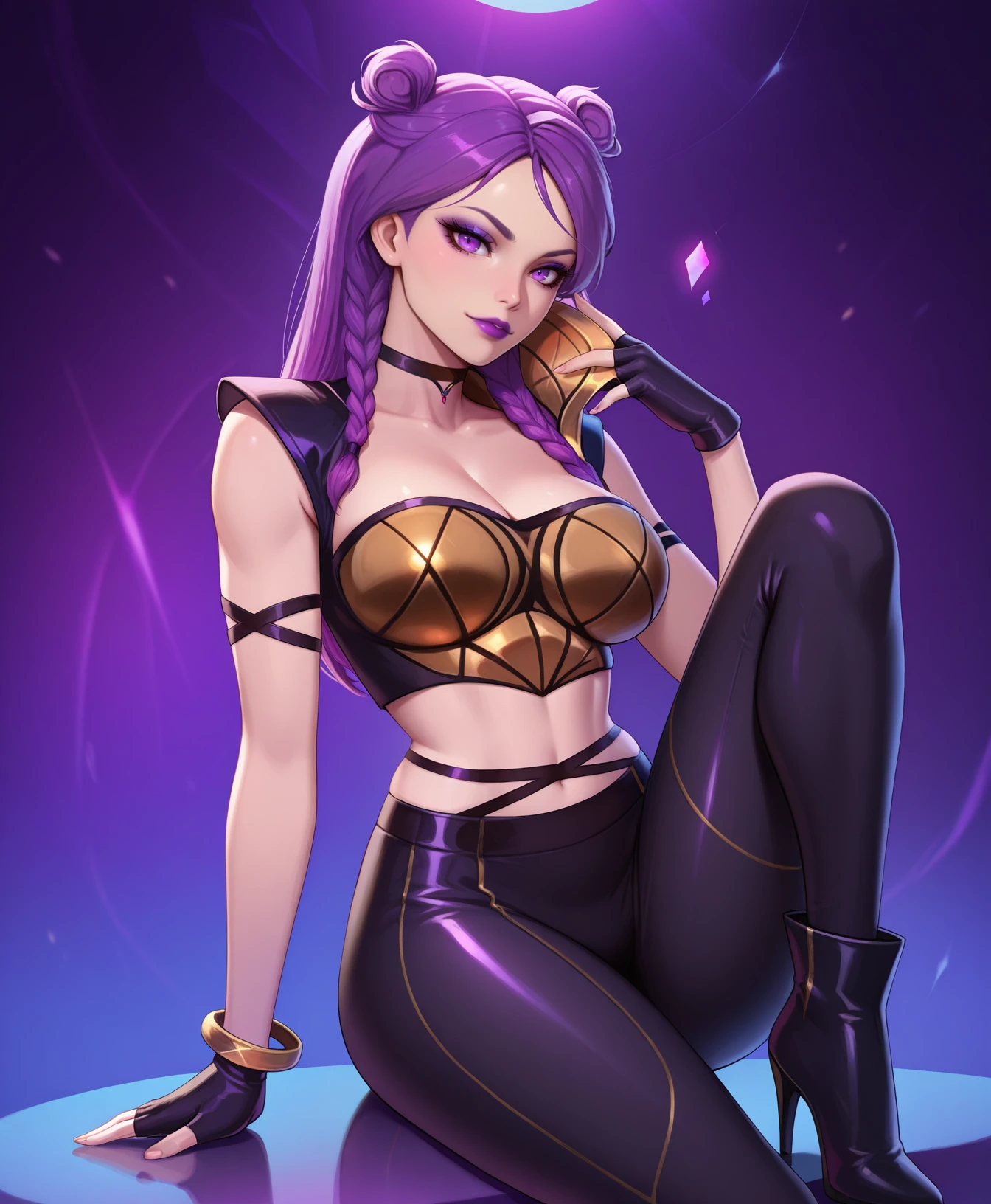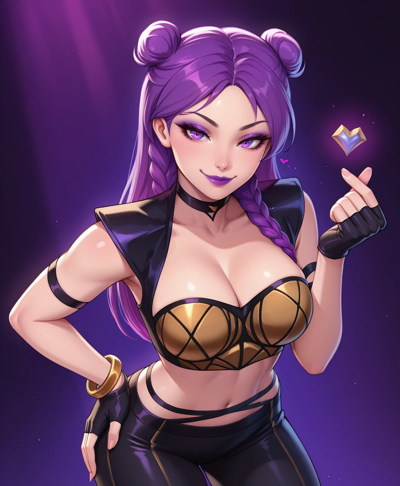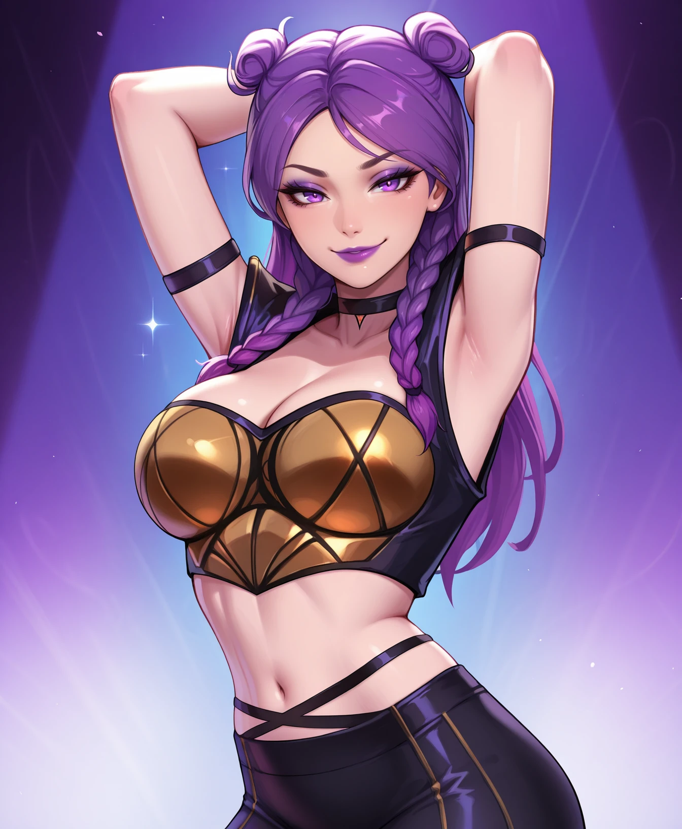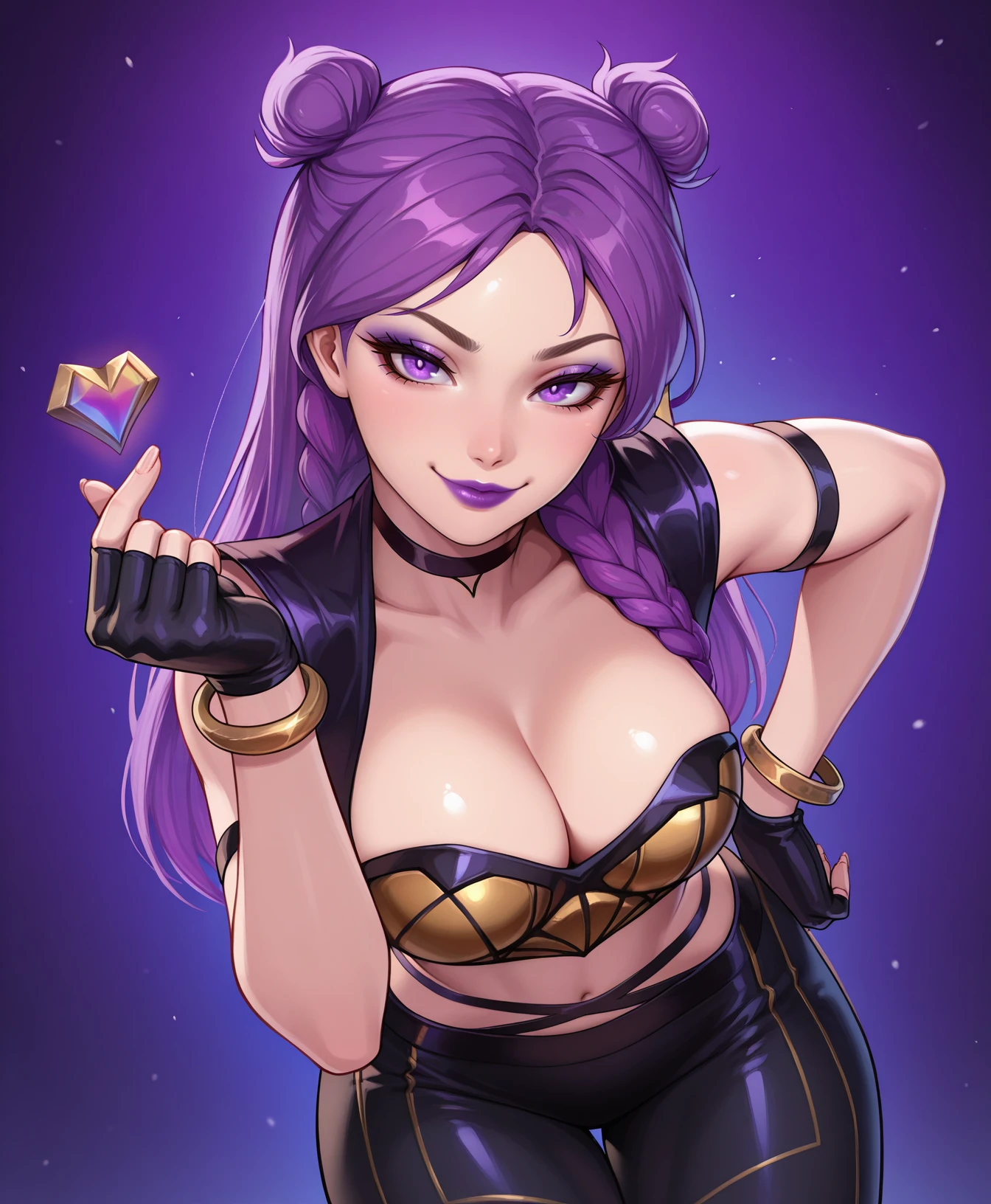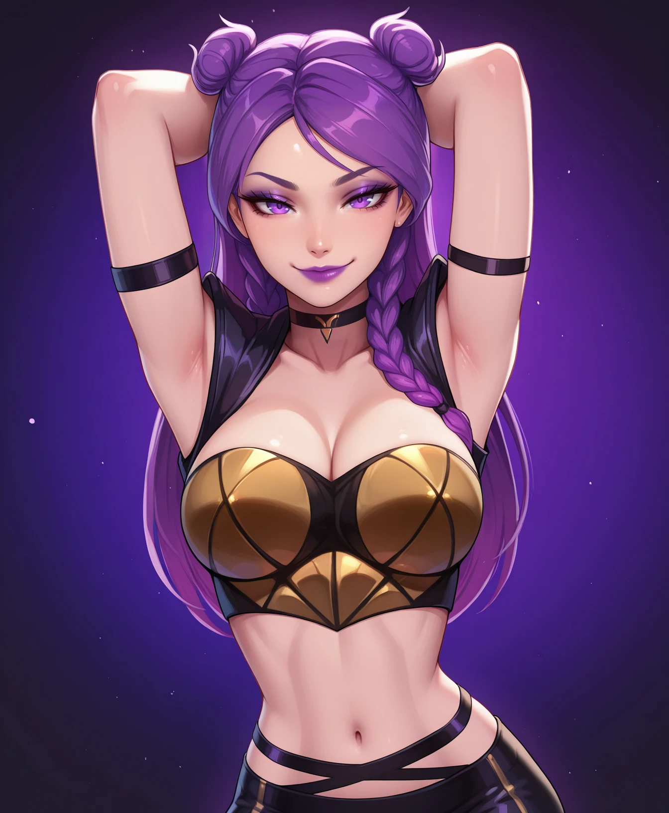 purple hair, purple lips, buns, braids, eyeshadow, choker