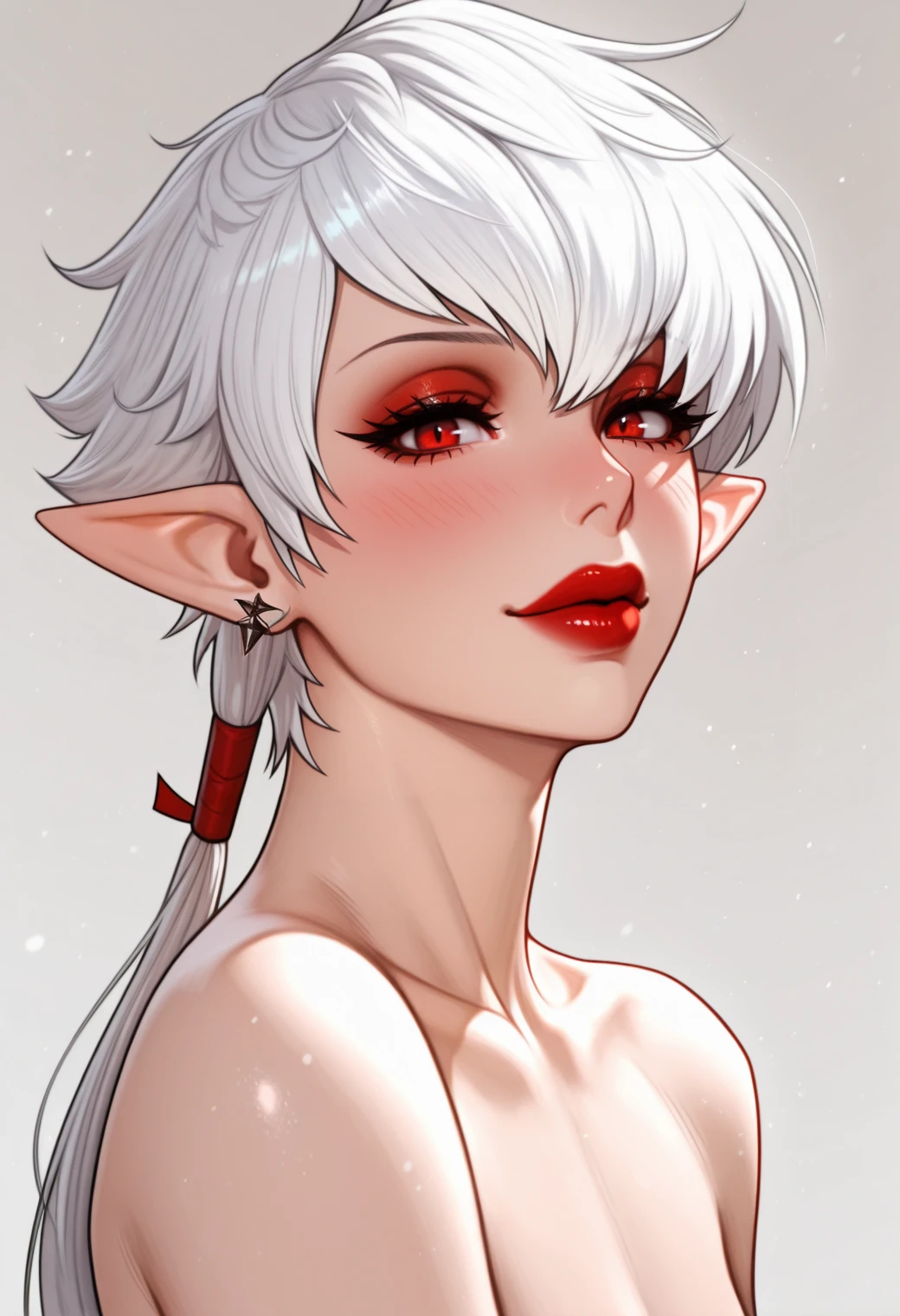 elezen, girl, white hair, small breast, high heels, submissive, long ponytail, red ribbon,
