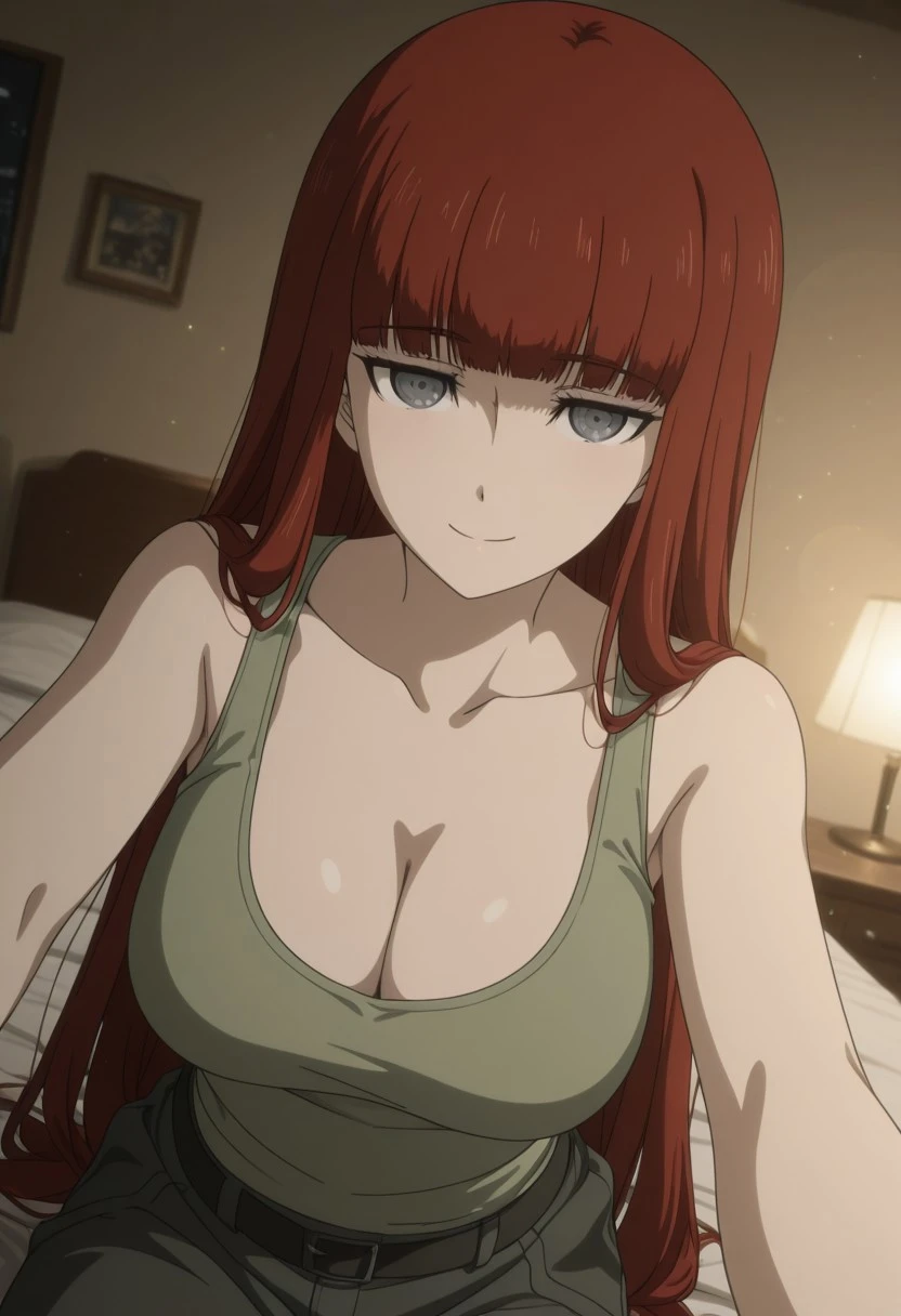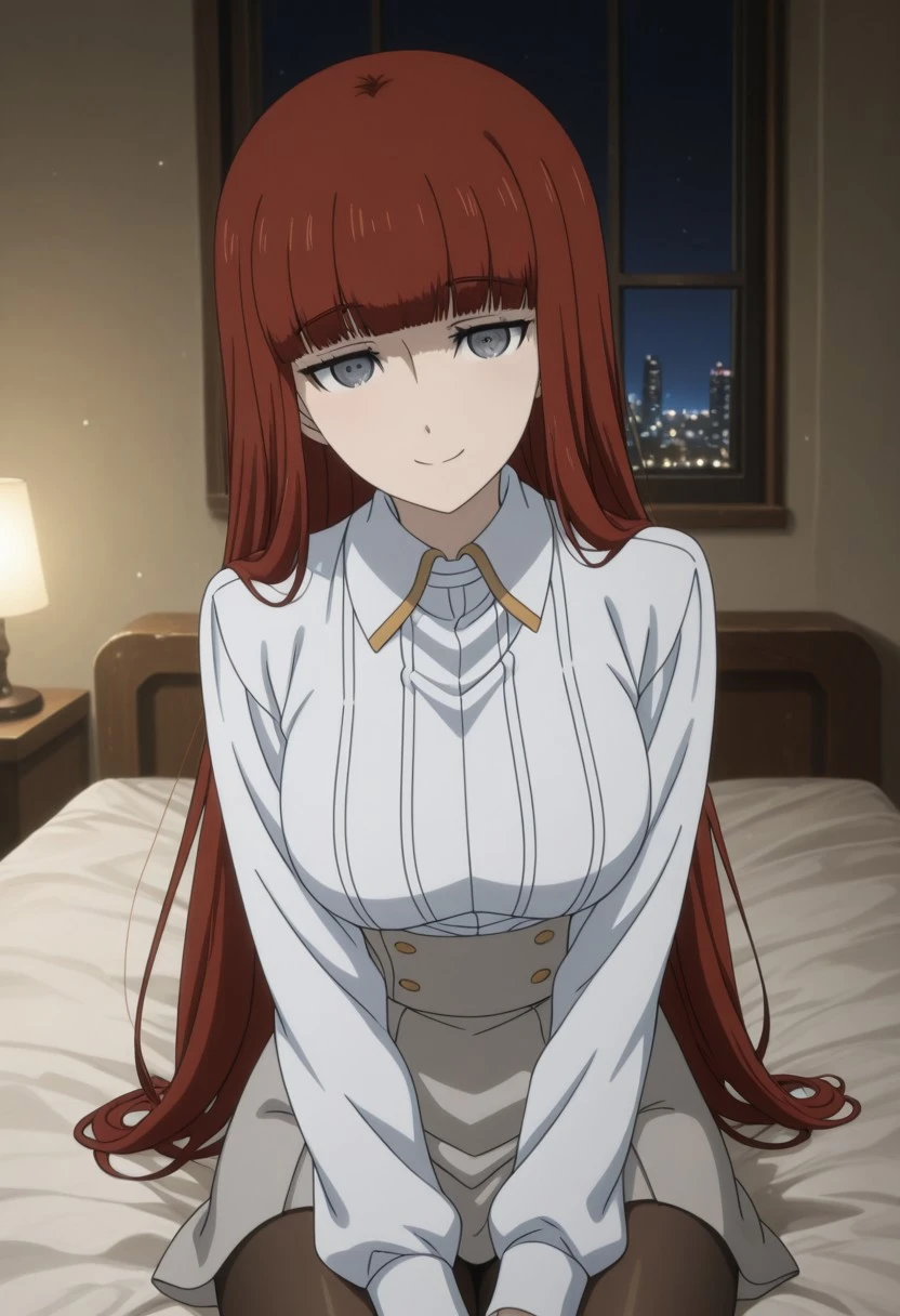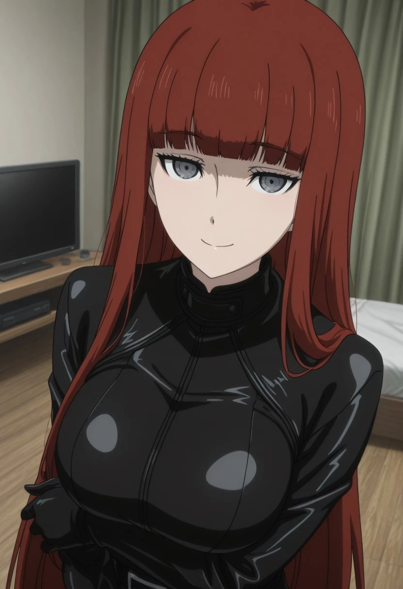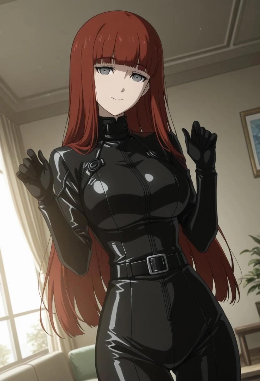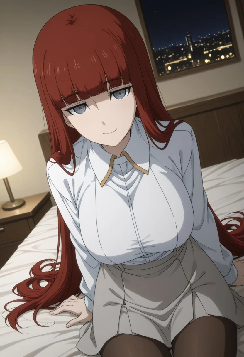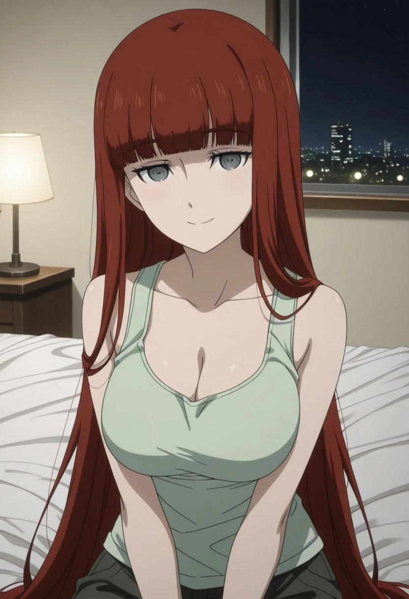 long hair, red hair, blunt bangs, red eyebrows, grey eyes