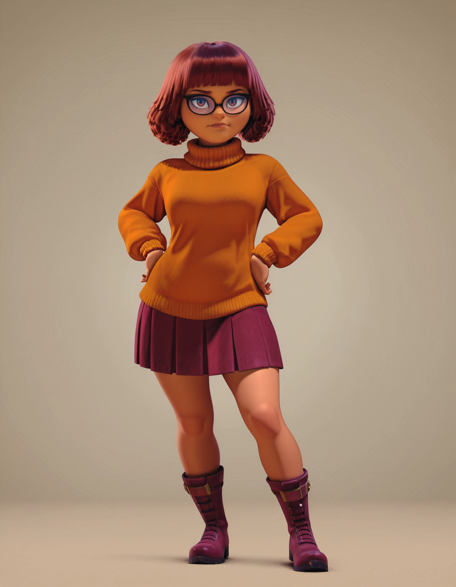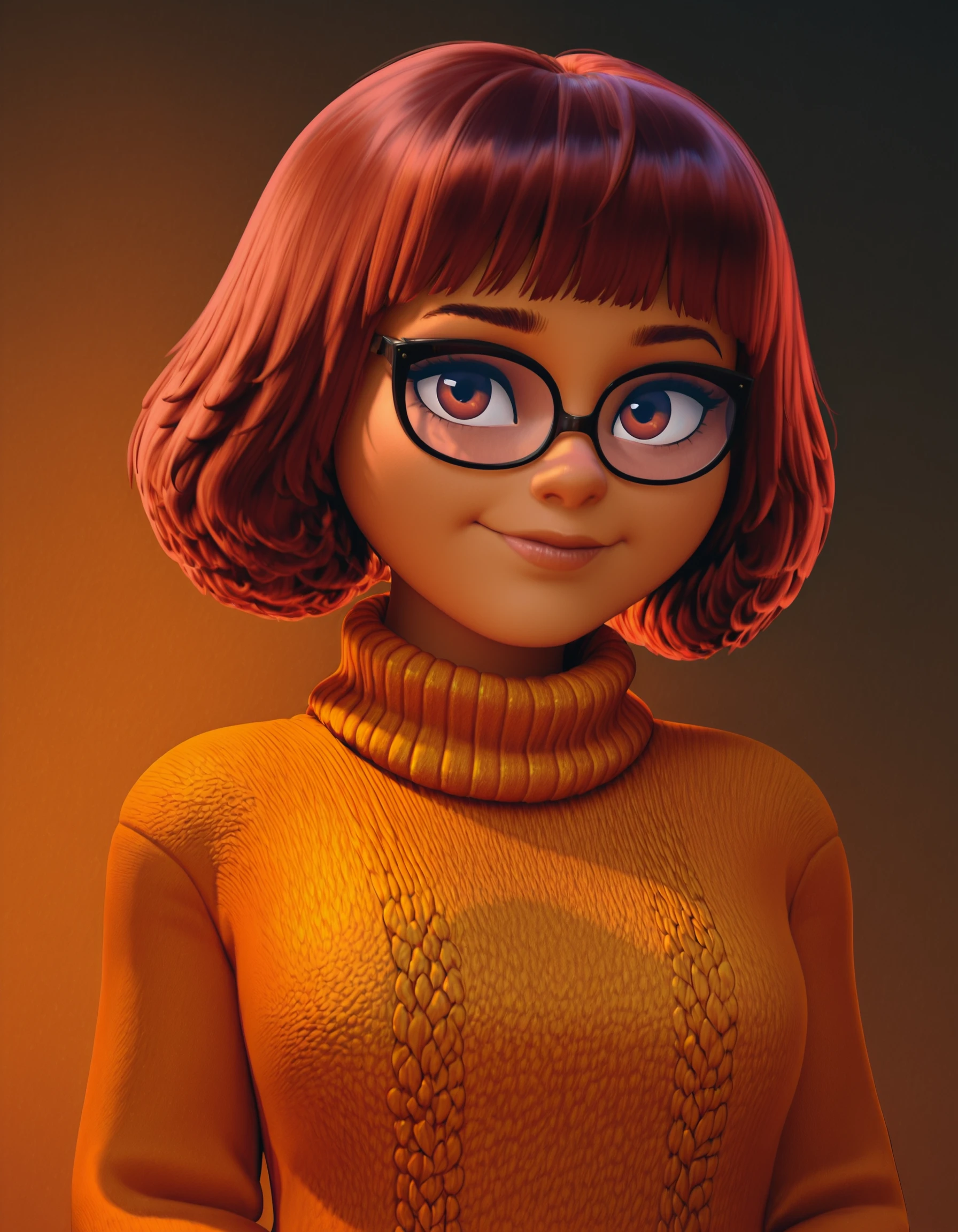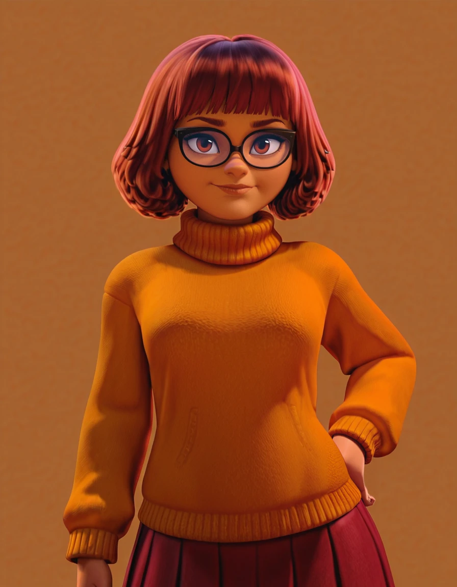 velma dinkley,scoob!, short hair,red hair,glasses, 1girl,smile, turtleneck, red skirt, orange sweater, brown eyes