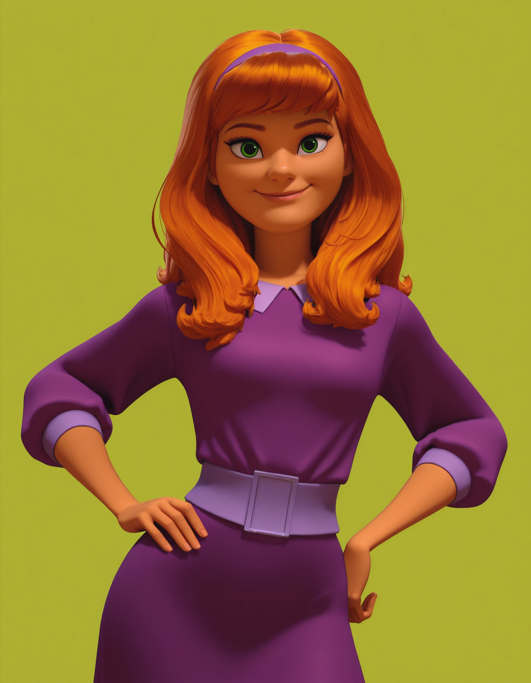 scoob! daphne blake, green eyes,1girl, solo, hairband,orange hair,long hair,purple dress