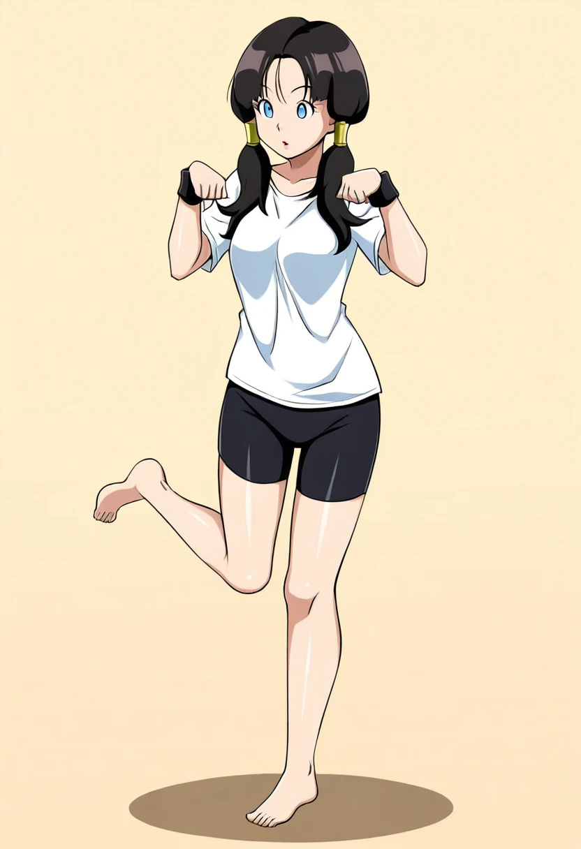 The model seems to go well with rolling_eyes and parted_lips for the facial expression, barefoot seems to increase the pose weight overall