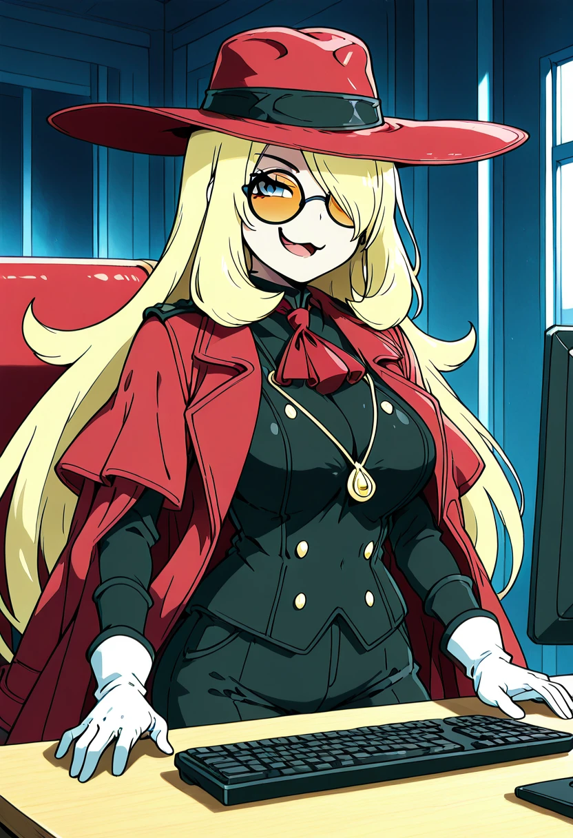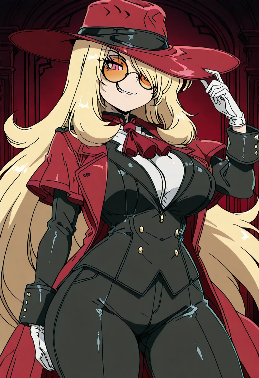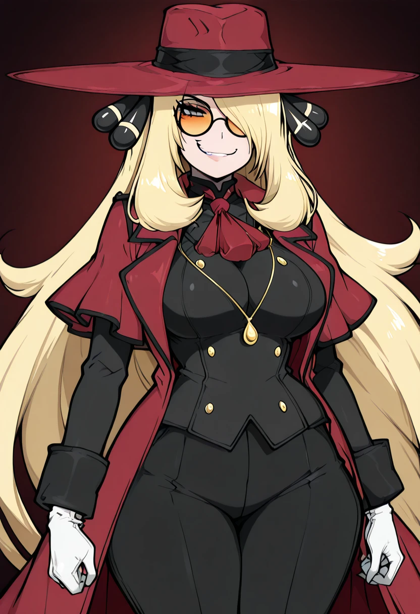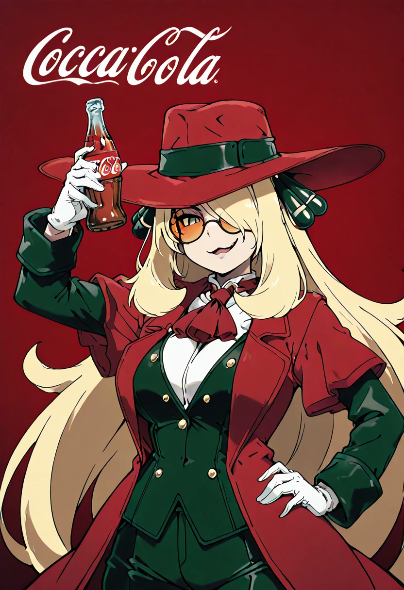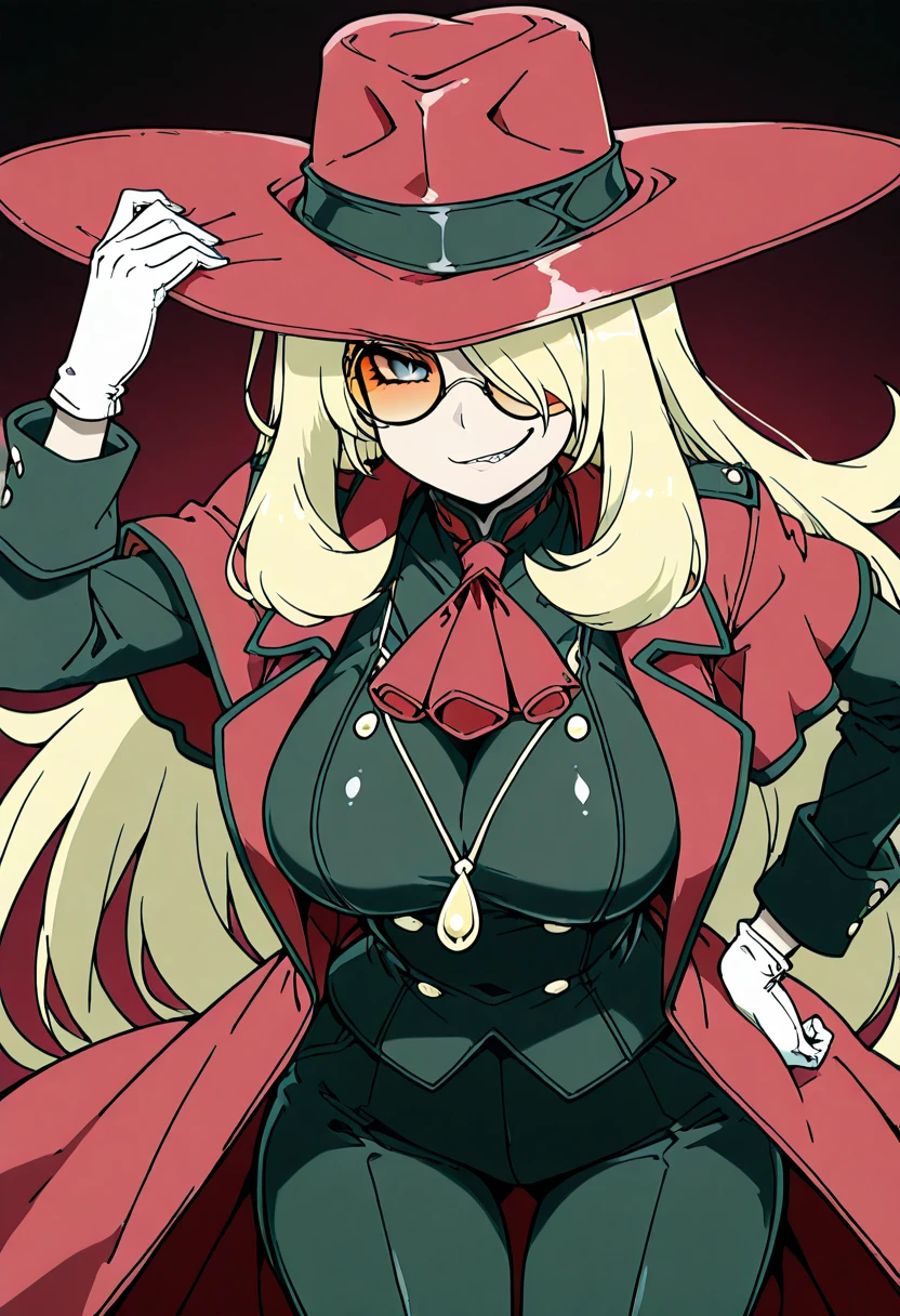 zzCynthiaHellsingCitron, blonde hair, long hair, hair over one eye, orange-tinted eyewear, round eyewear, red hat, red coat, red ascot, white shirt, black jacket, white gloves, black pants,