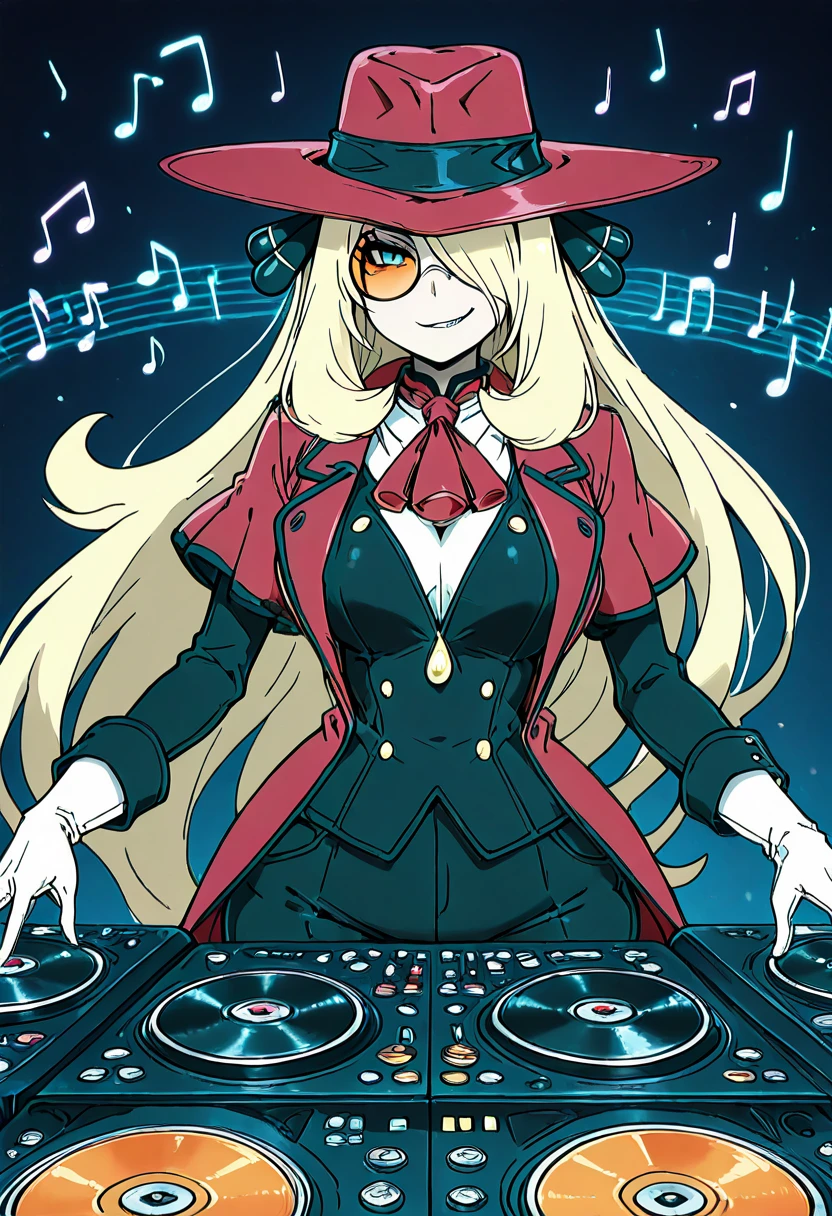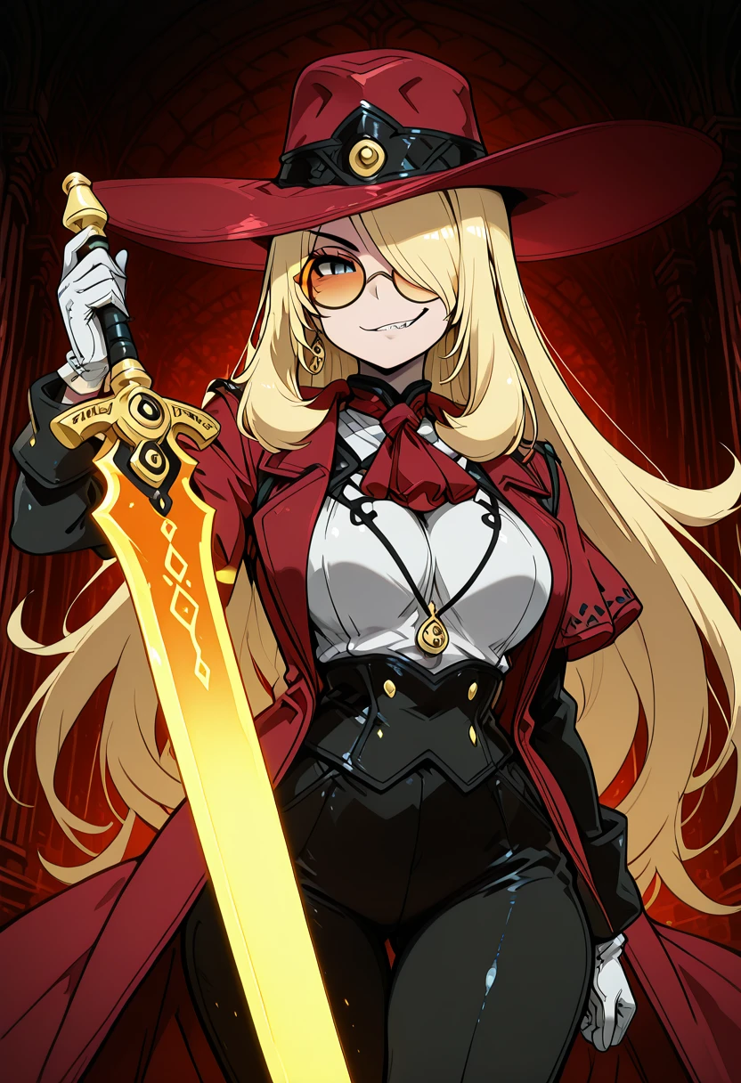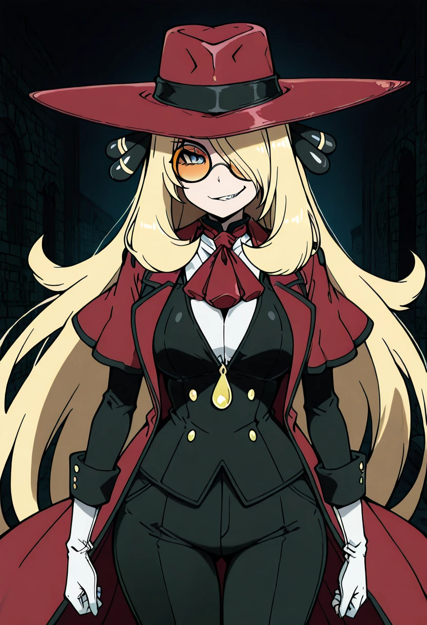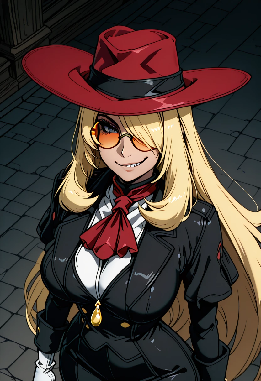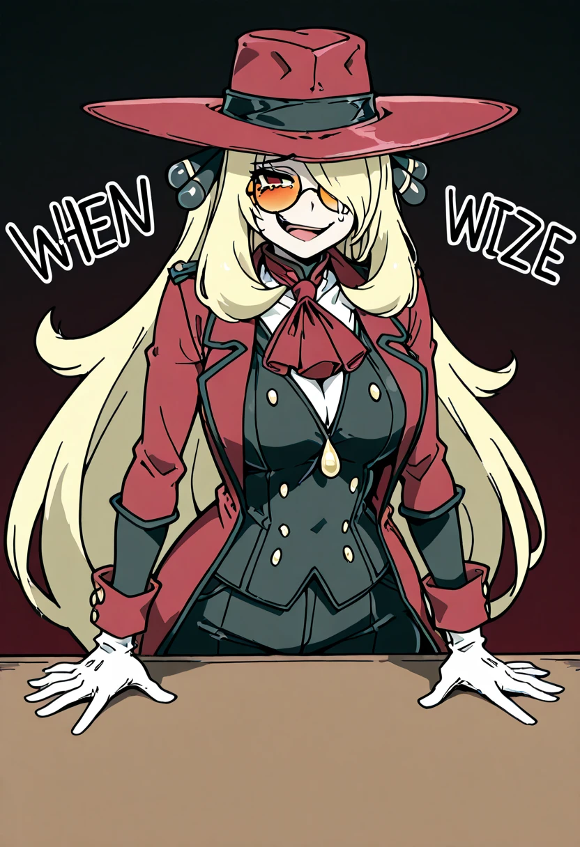 zzCynthiaHellsingCitron, blonde hair, long hair, hair over one eye, orange-tinted eyewear, round eyewear, red hat, red coat, red ascot, white shirt, black jacket, white gloves, black pants,
