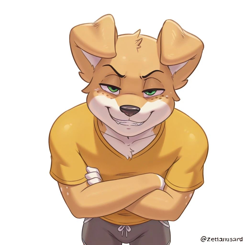 joelmusard, zetaharu anthro, canine, dog, light brown fur, tan fur, cream fur, darker ears, darker nose, freckles, green eyes