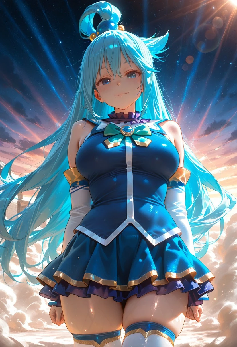 Aqua from Konosuba, long hair, blue eyes, hair ornament, very long hair, aqua-blue hair, hair rings, single hair ring, hair bobbles, medium , skirt, shirt, thighhighs, bare shoulders, detached sleeves, white thighhighs, blue skirt, blue shirt, green bow,
