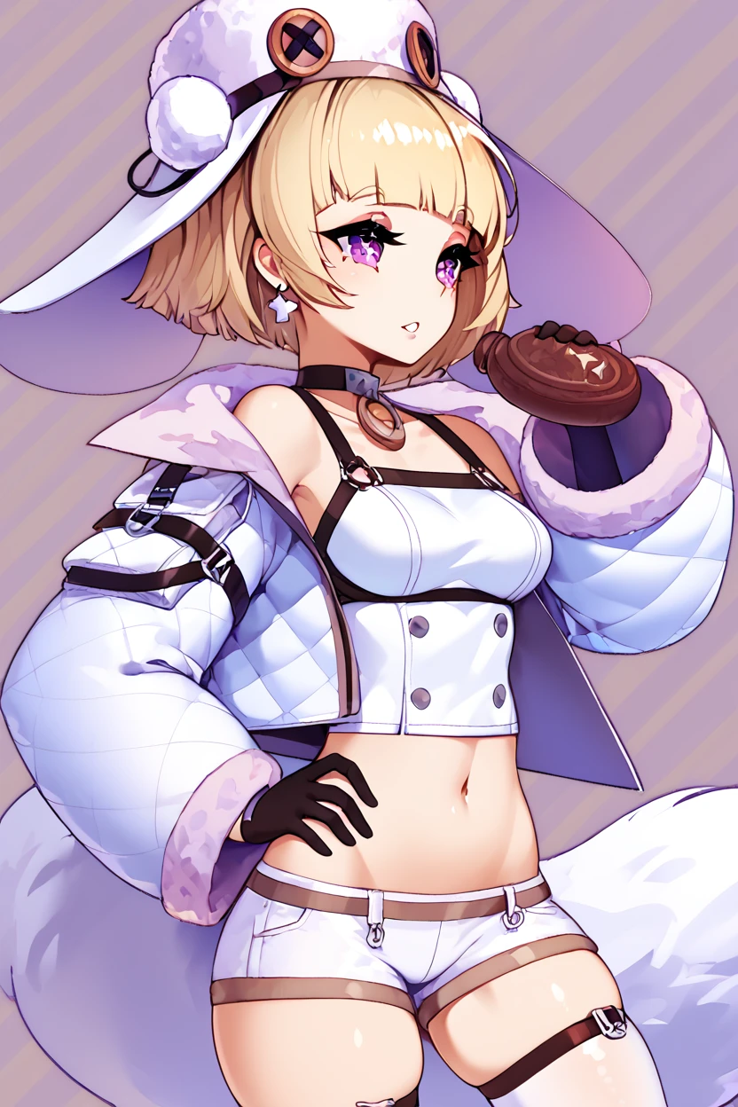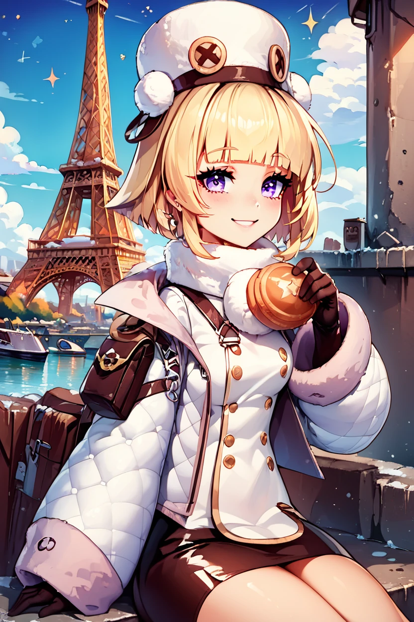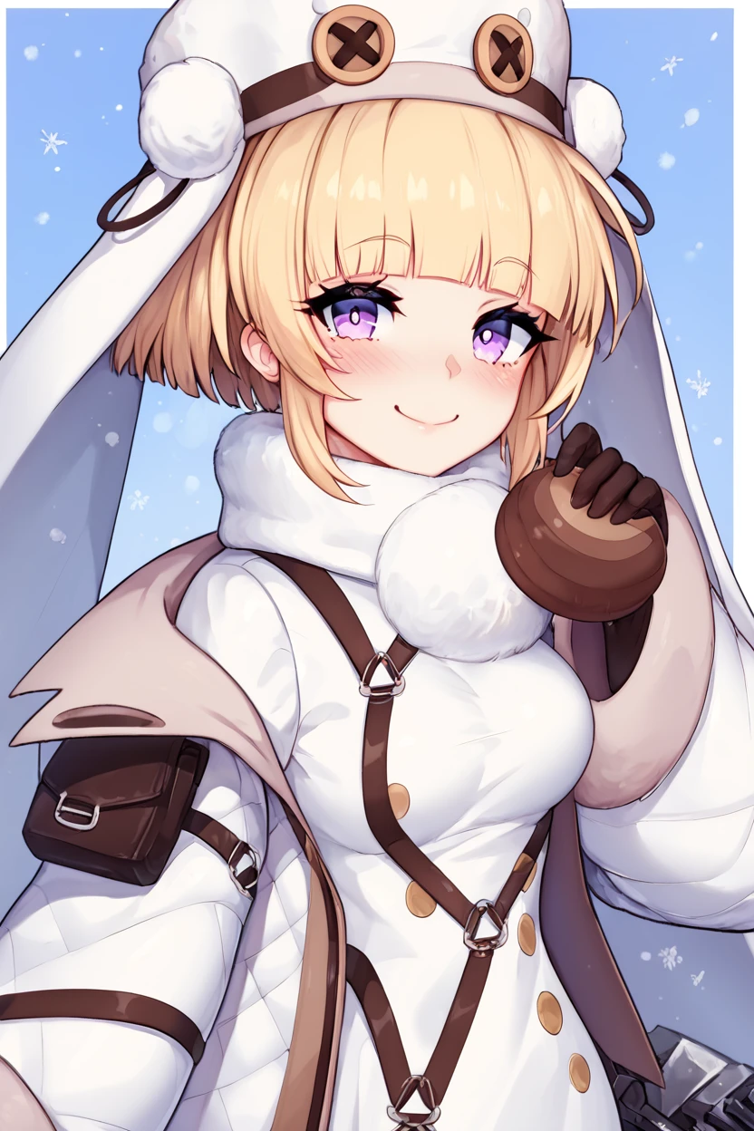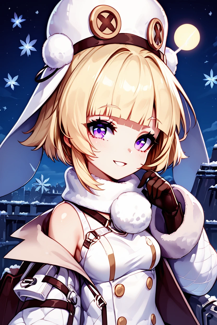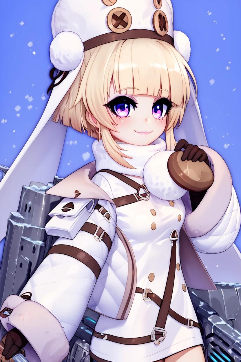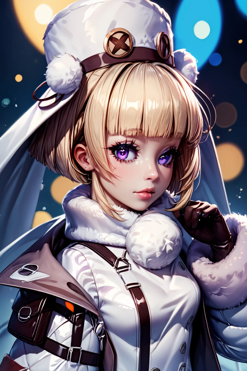 zzGrozny, purple eyes, blonde hair, short hair, black gloves, long sleeves, hat, coat, fur trim, white headwear, fur hat, jacket,