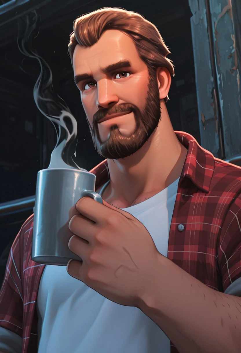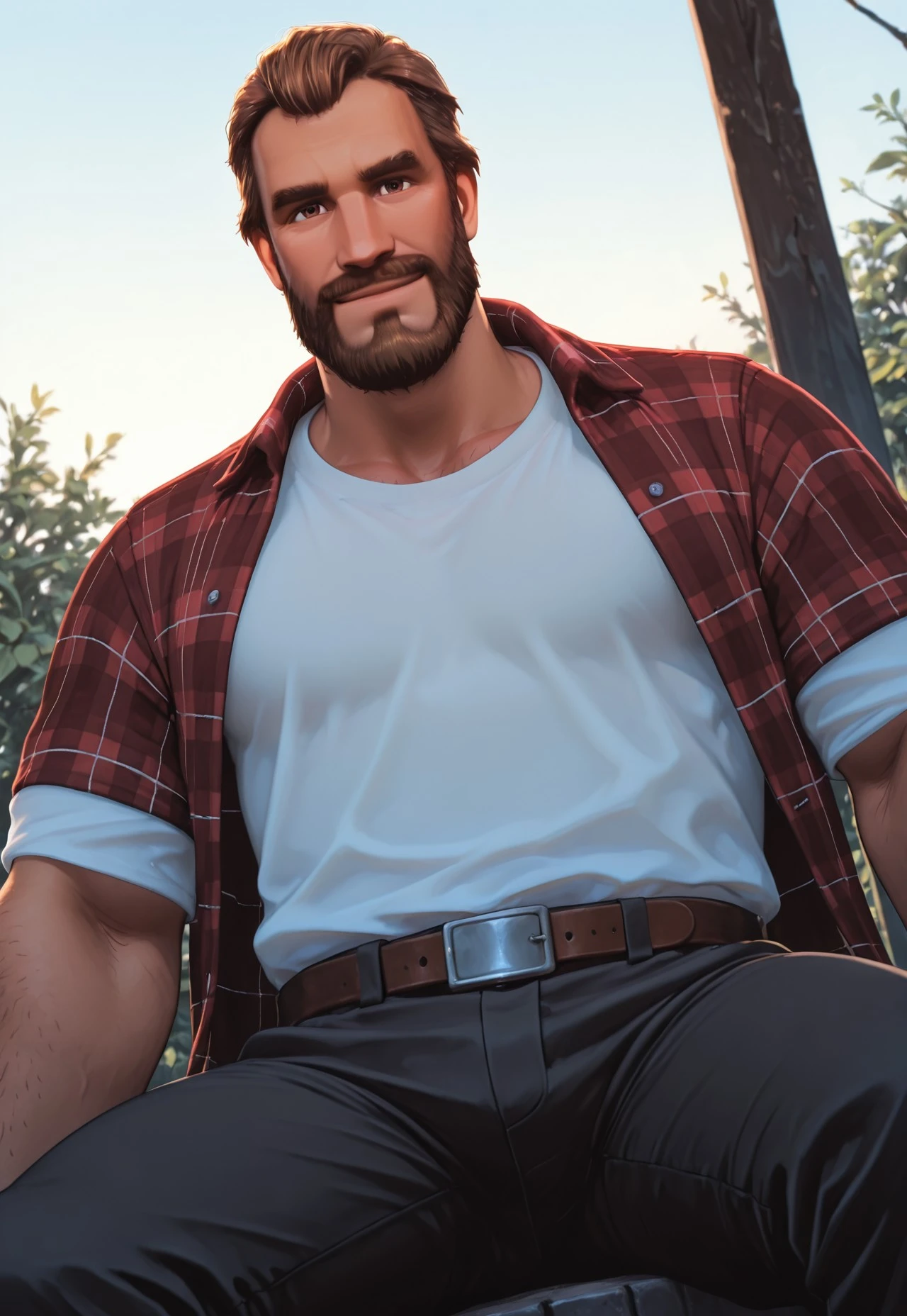 H4NKLDR, brown hair, short hair, facial hair, beard, brown eyes, plaid shirt, red shirt, white t-shirt,
