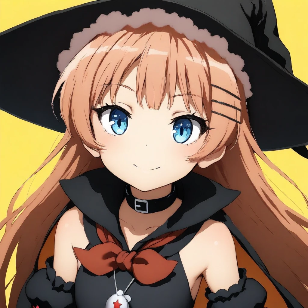 topspeed, light brown hair, twintails, pigtails, hair clip, blue eyes, witch hat, black hat, black collar, sleeveless dress, short dress, red bow, necklace, detached sleeves, puffy sleeves, long black gloves, cloak, black thigh high boots