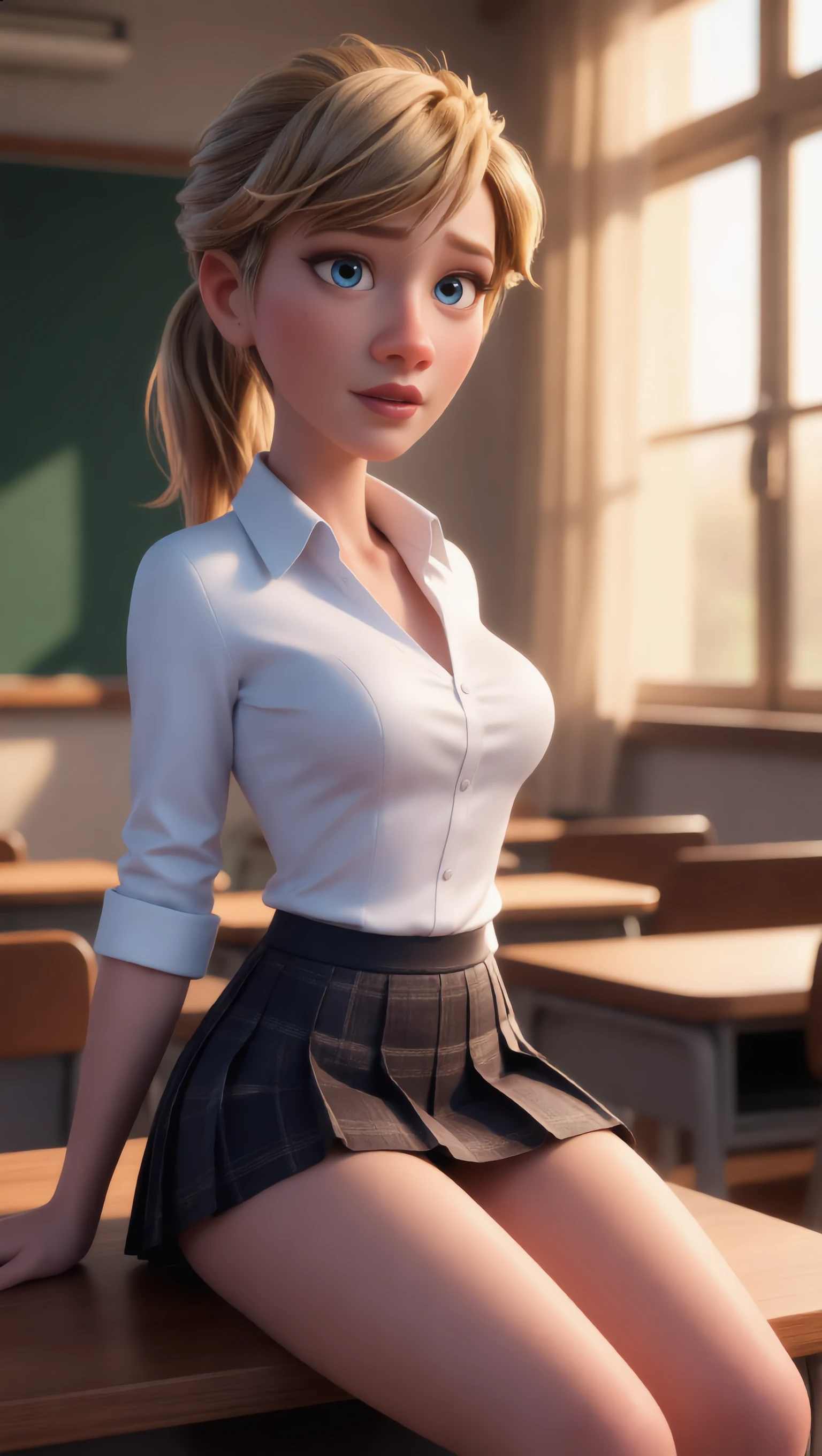 Rileyaio, pixar style, large eyes, disney, masterpiece, best quality, 4k, highres, (ultra-detailed), amazing quality, very aesthetic, illustration, dynamic lighting, night, nighttime, evening, moonlight, detailed background, disney, slender waist, wide hips, long torso, pronounced collarbone, long legs, curvy legs, voluptuous, looking at viewer, facing the viewer, seductive gaze, smiling, flirty, posing, modeling