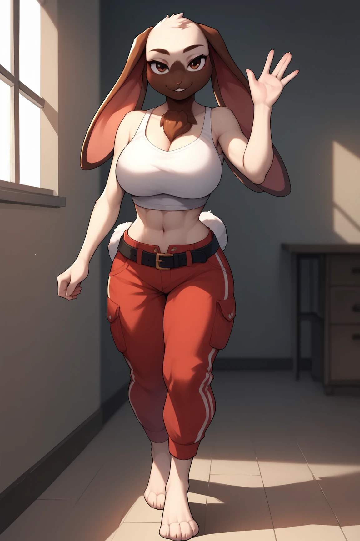 KyuuBSXL, anthro furry, furry female, white fur, two-tone fur, brown eyes, animal ears, rabbit ears, rabbit tail, snout, large breasts, red track jacket, jacket closed, red track pants, barefoot