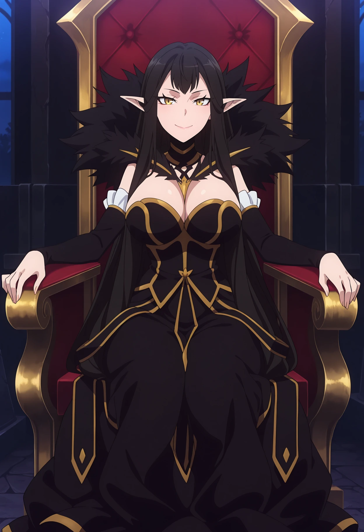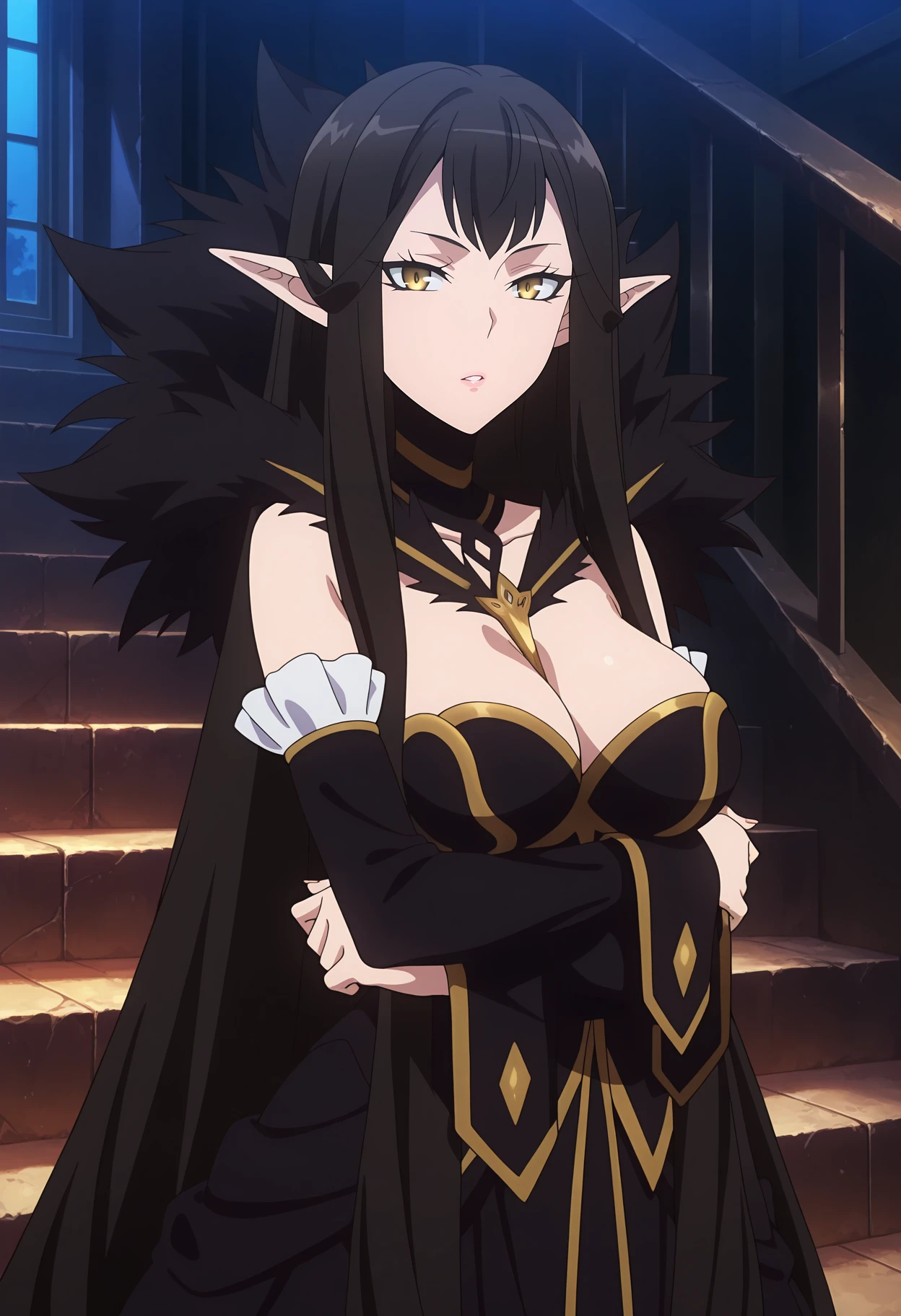 very long hair, black hair, yellow eyes, pointy ears