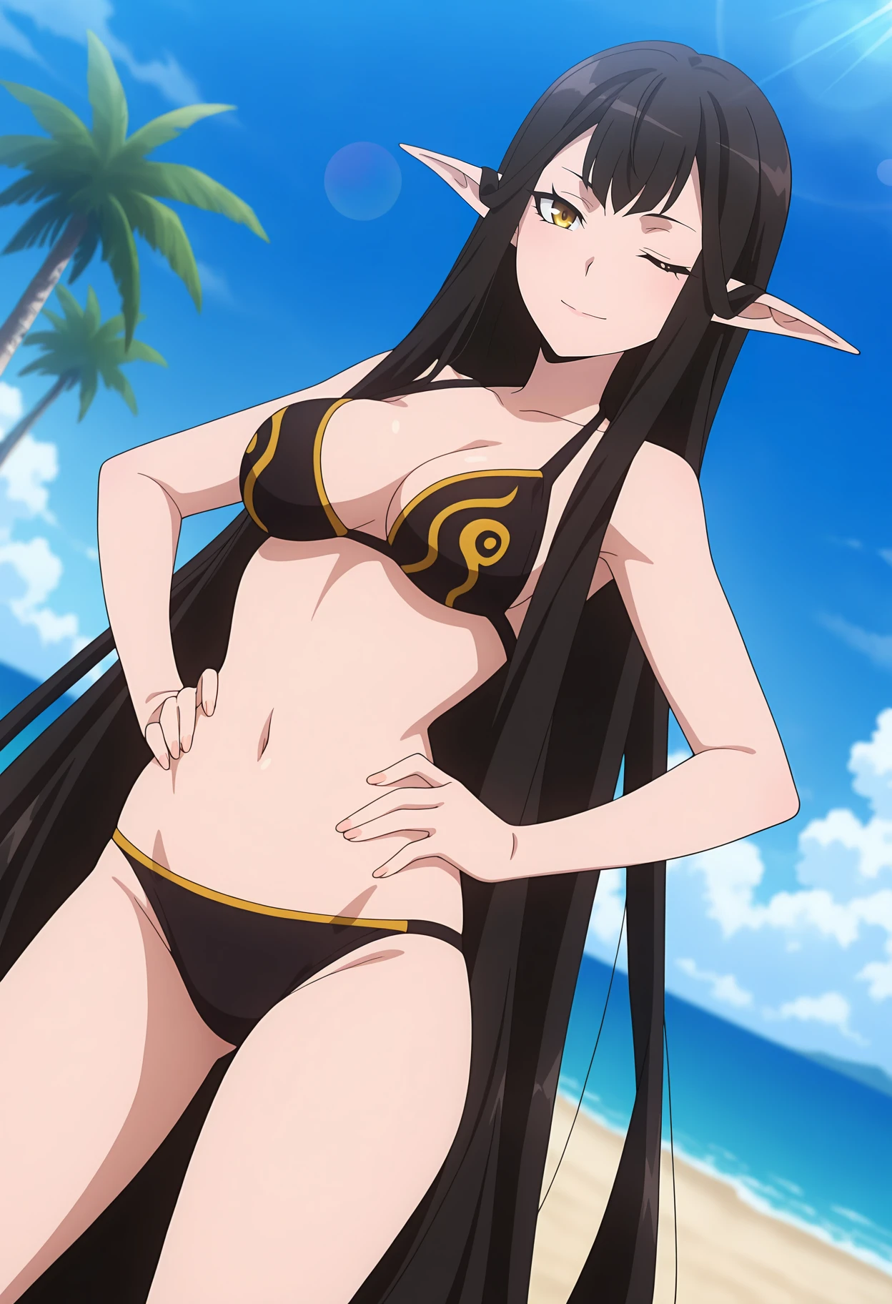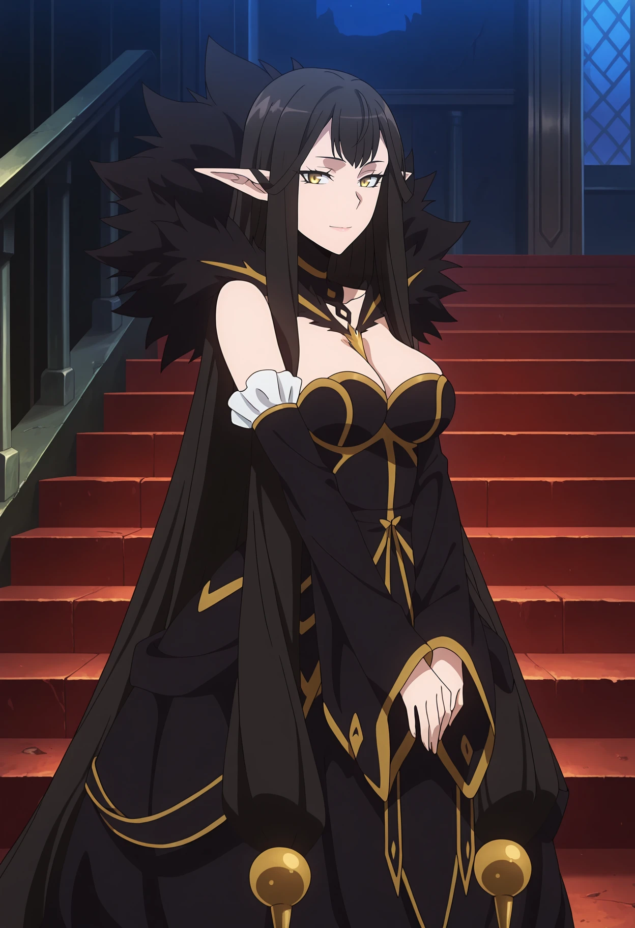 absurdly long hair, black hair, yellow eyes, pointy ears
