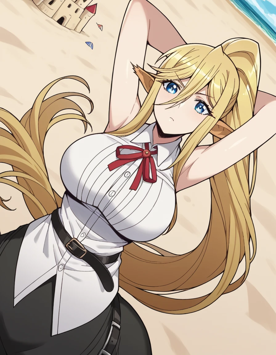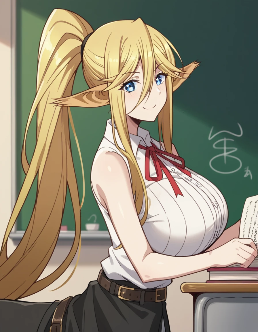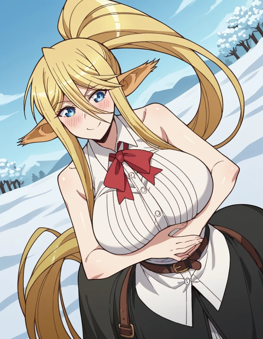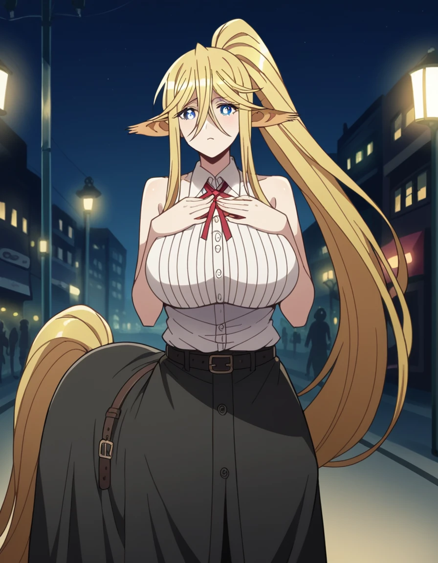 centorea shianus, long hair, blue eyes, blonde hair, large breasts, animal ears, very long hair, tail, ponytail, pointy ears, huge breasts, horse ears, monster girl, horse tail, taur, centaur