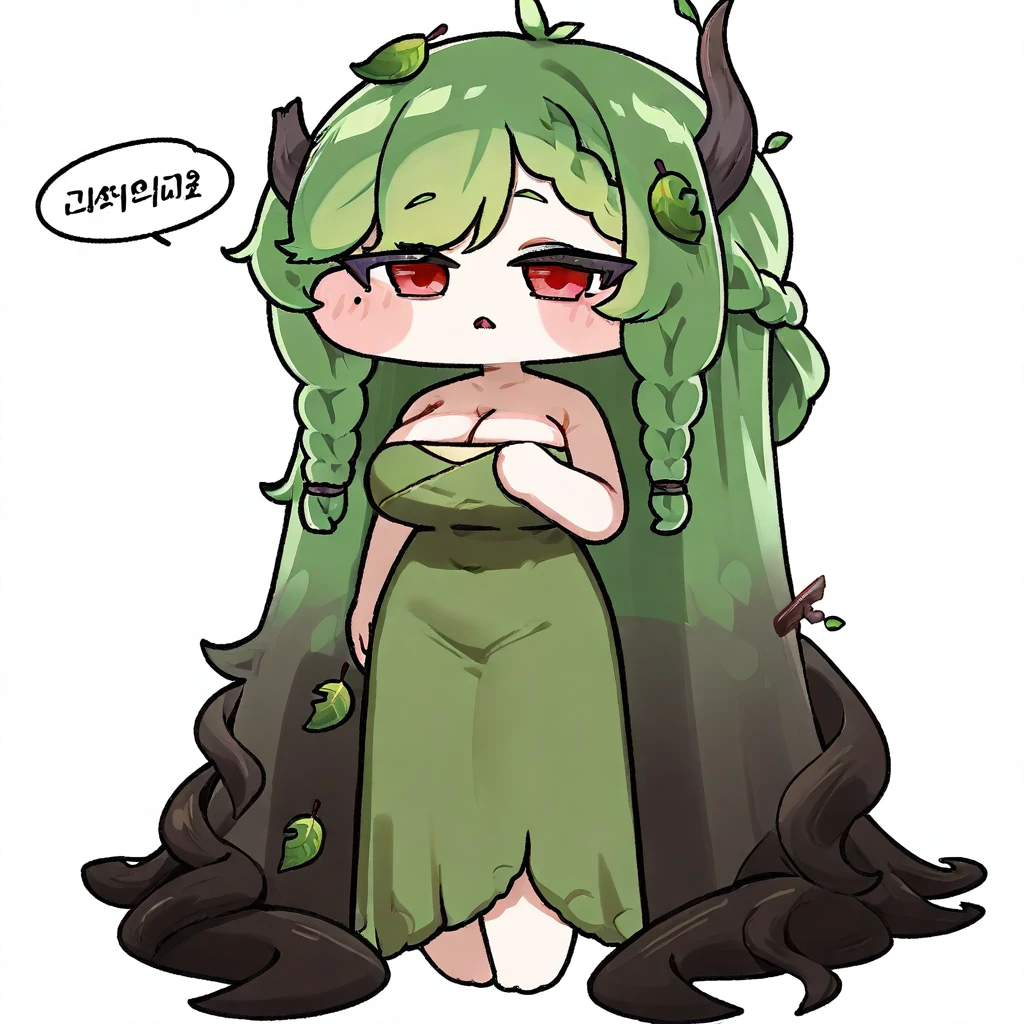 (branch, red eyes, mole under eye, huge breasts, green hair, green dress, cleavage, leaf, branch horns, twin braids)