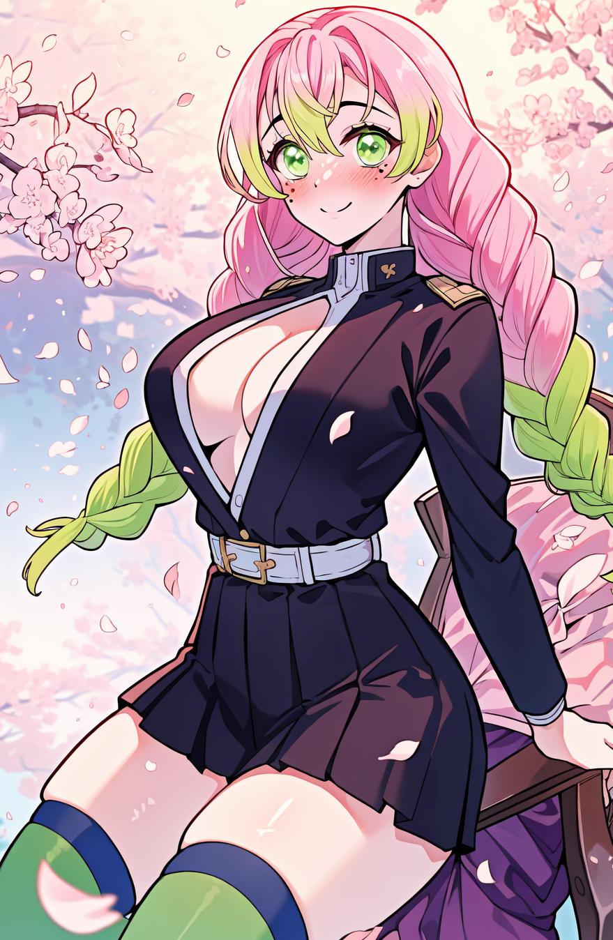 Recommended prompts: mitsuri_dms, 1girl, solo, green eyes, ((black_special_pupil)), eyelashes, thick eyelashes, mole, mole under eye, green hair, pink hair, braids, twin braids, hair between eyes, long hair, large breasts, skirt, (black skirt), pleated skirt, belt, white belt, long sleeves, white sleeves, fluffy sleeves, thighhighs, green legwear, open clothes, zettai ryouiki, haori, demon slayer uniform, japanese clothes, cleavage