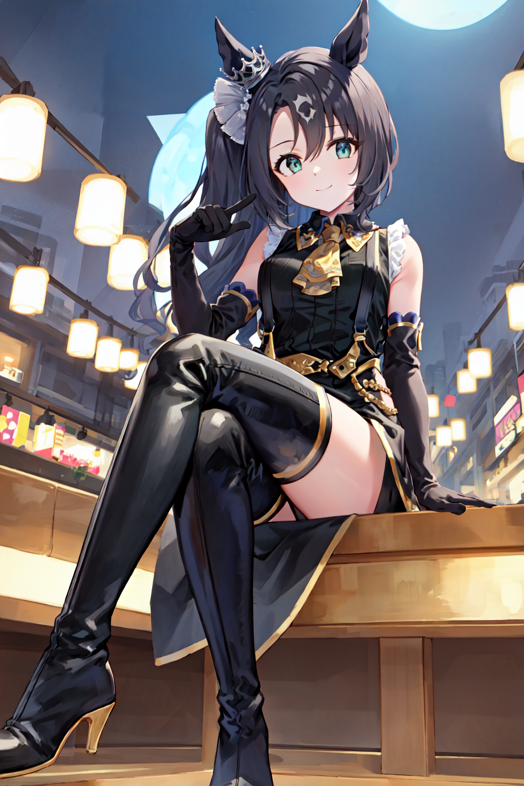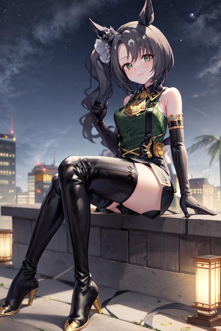 ear ornament, black gloves, elbow gloves, collared shirt, suspenders, bare shoulders, yellow ascot, green shirt, sleeveless shirt, black shorts, highhighs, thigh boots, black footwear