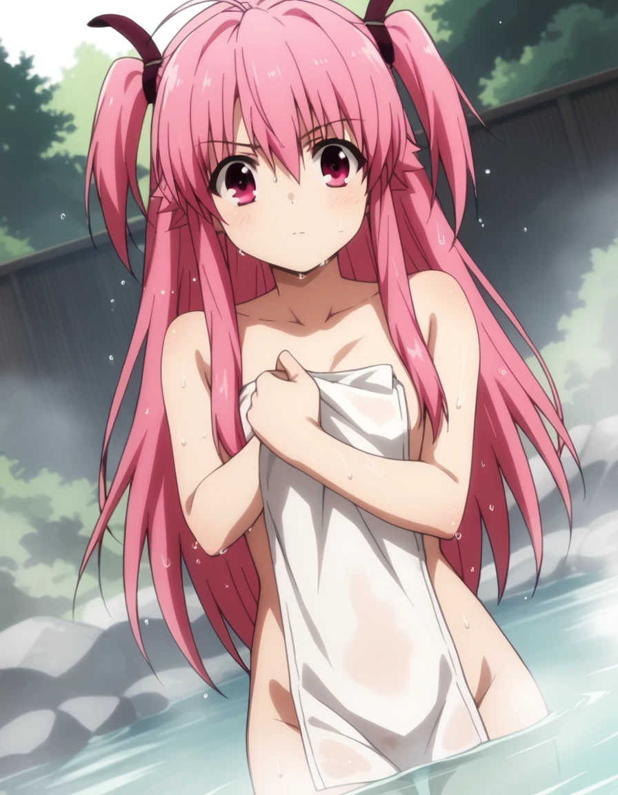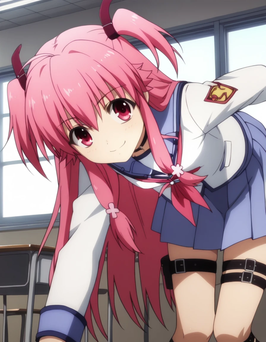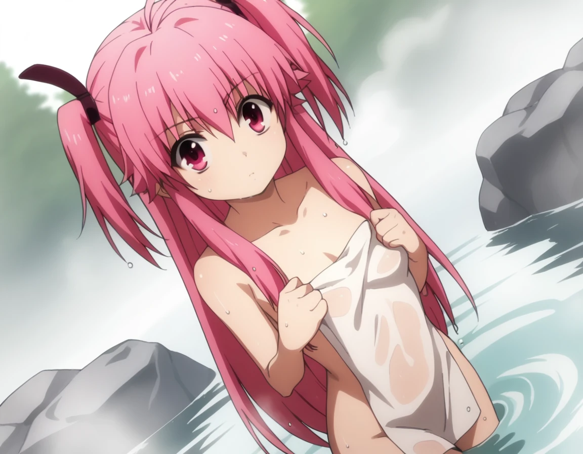 yui, long hair, pink hair, pink eyes, two side up,