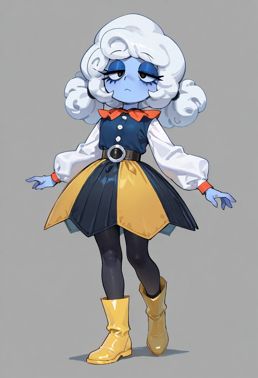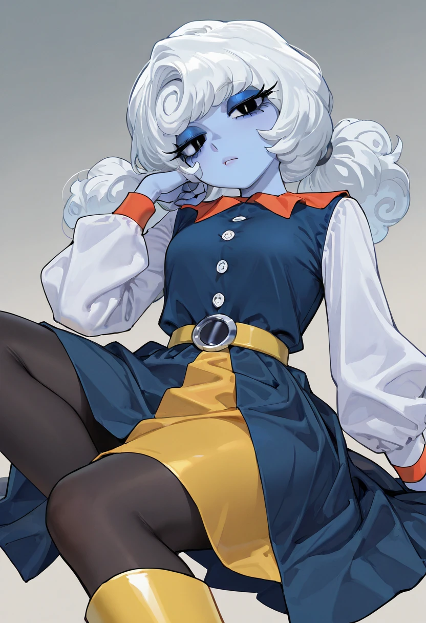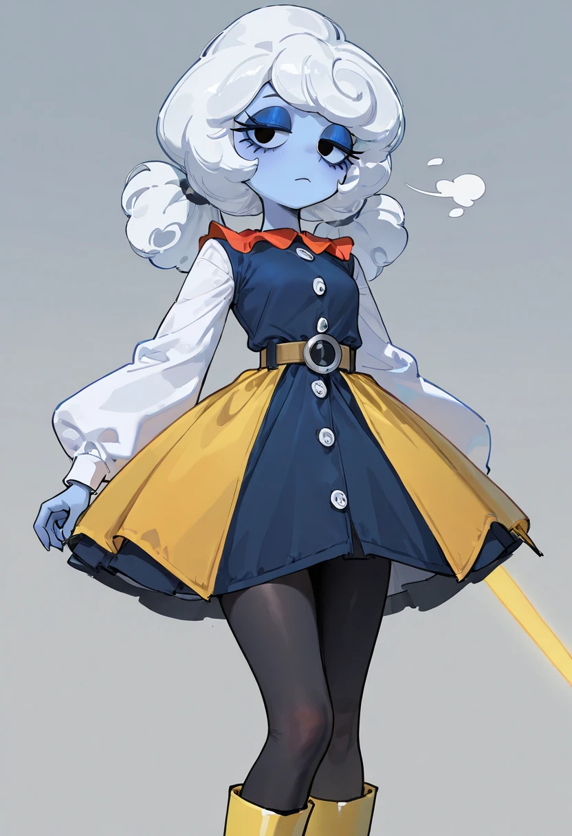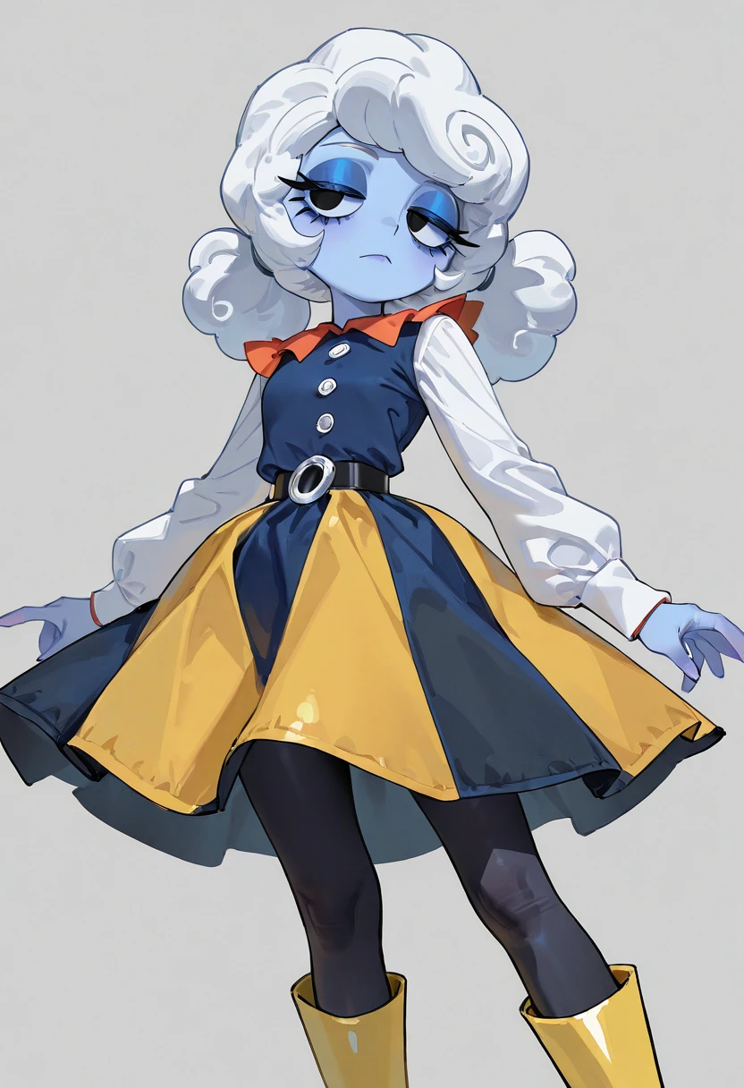 blue eyeshadow, long eyelashes, black eyes, blue skin, dress, skirt, buttons, black black pantyhose, white hair, blue shirt, white sleeves, yellow boots, belt,