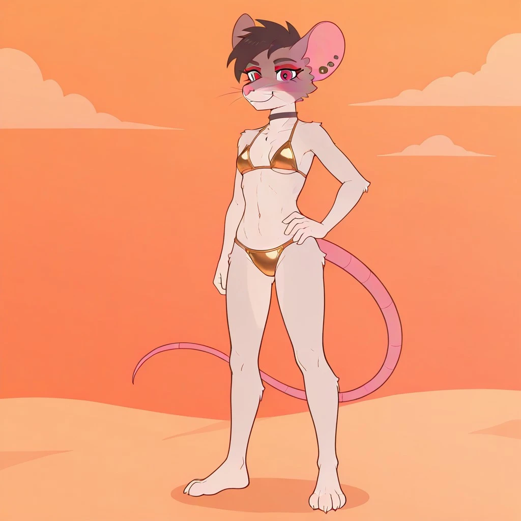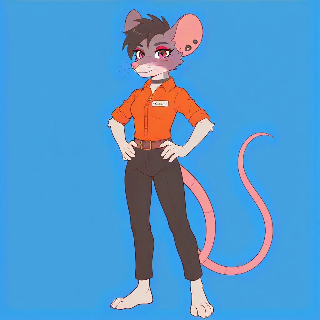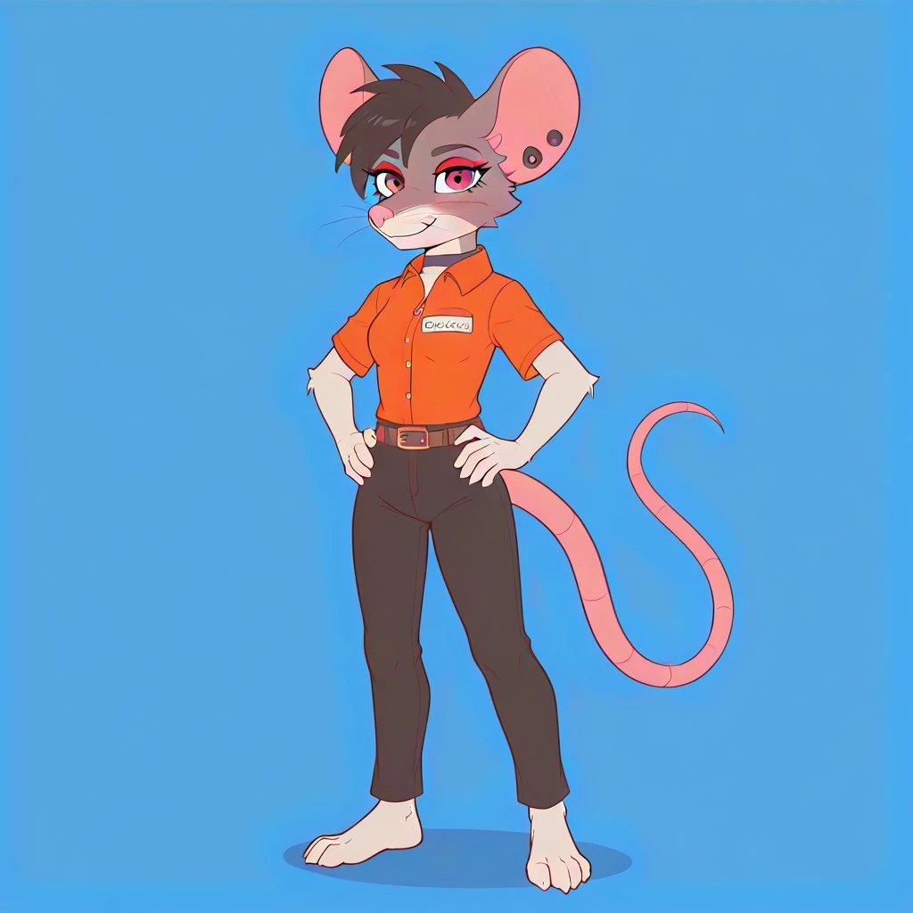 rodent, rat, rat girl, gray and white fur, pink nose, whiskers, black hair, red eyes, rat ears, rat tail, ear piercings, gauged ears, red eyeshadow, black choker,