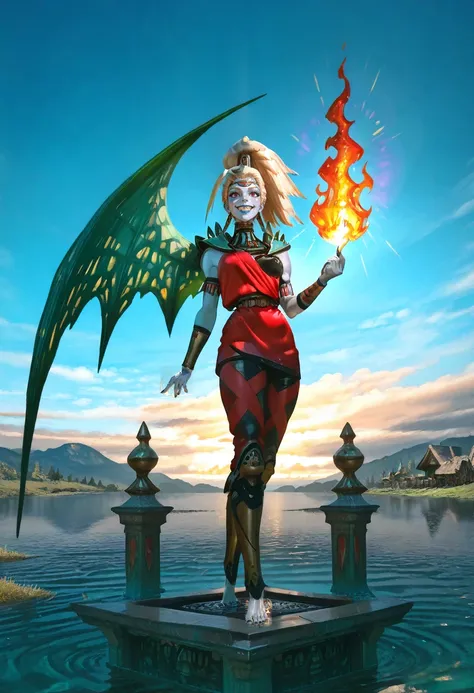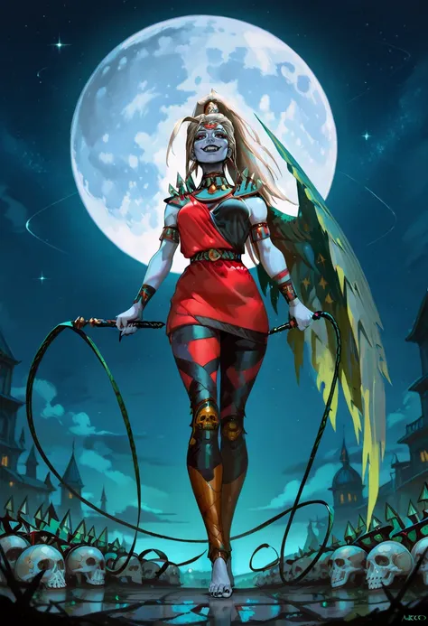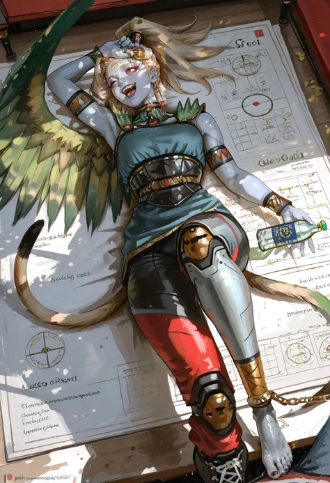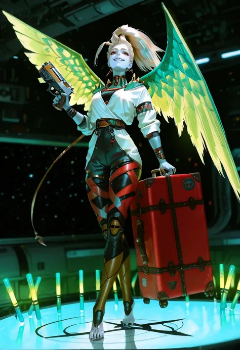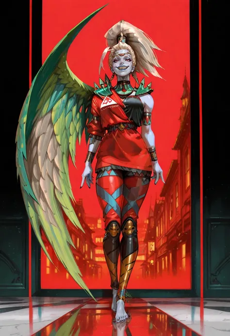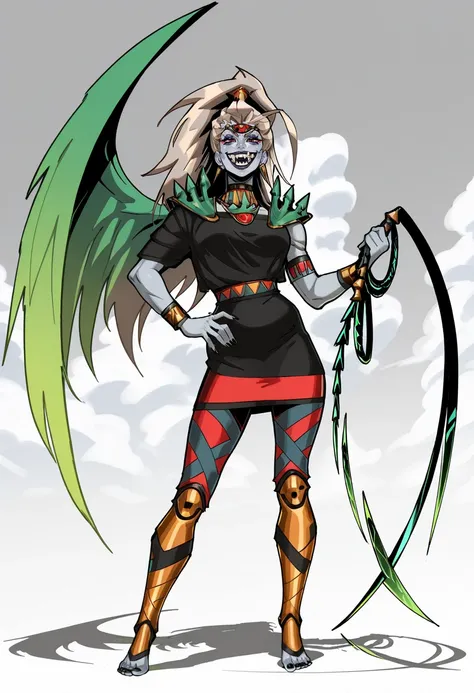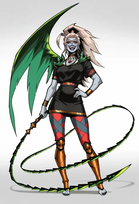 Alecto, colored skin, grey skin,blue skin, single green wing, barefeet, black toenail polish,toes,