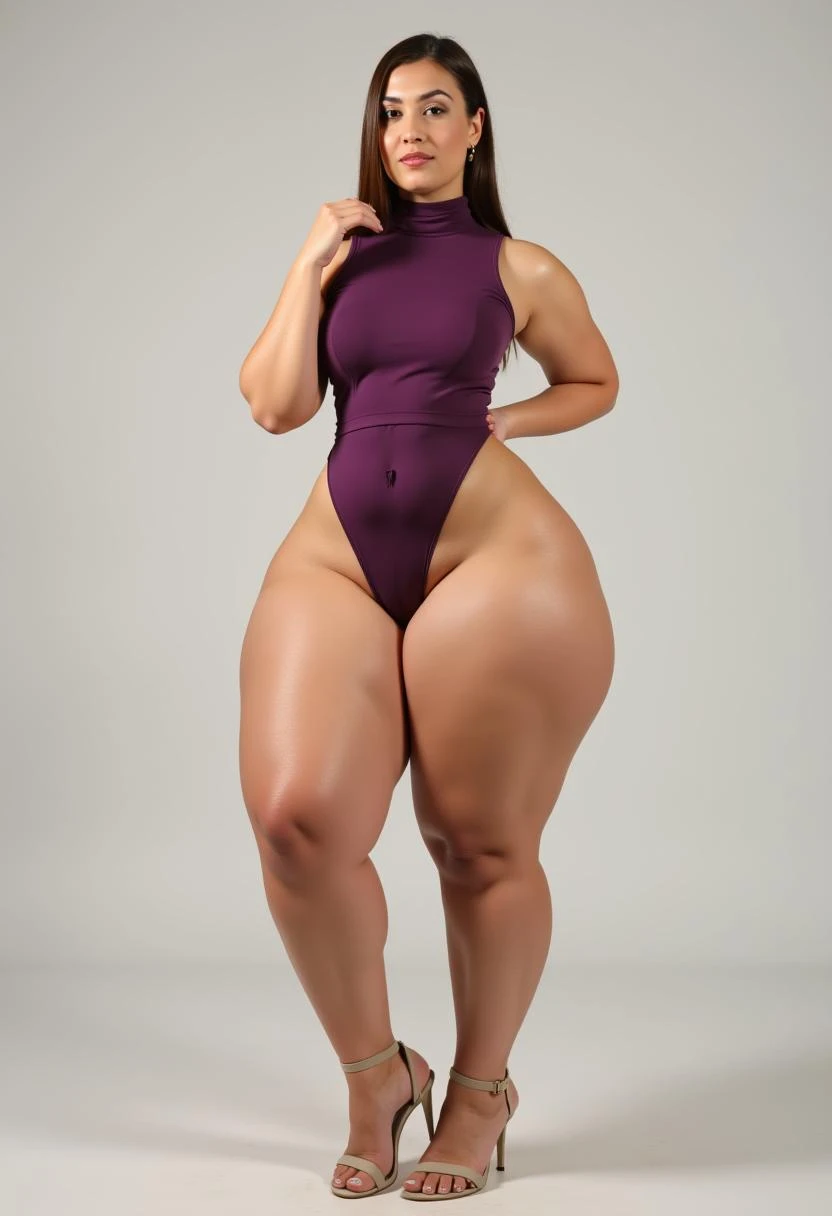 her upper body is slim and small chest, flat breasts, while her lower body is extra curvy, wide big hips and thick wide legs