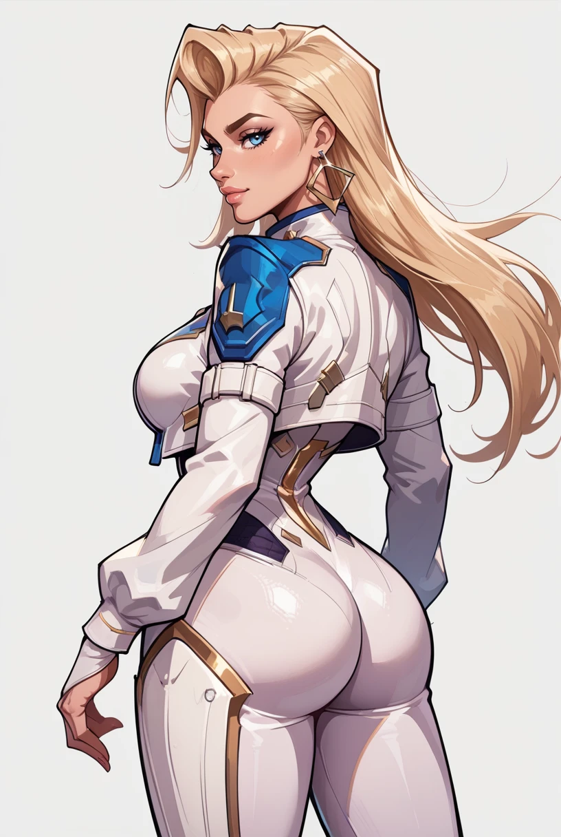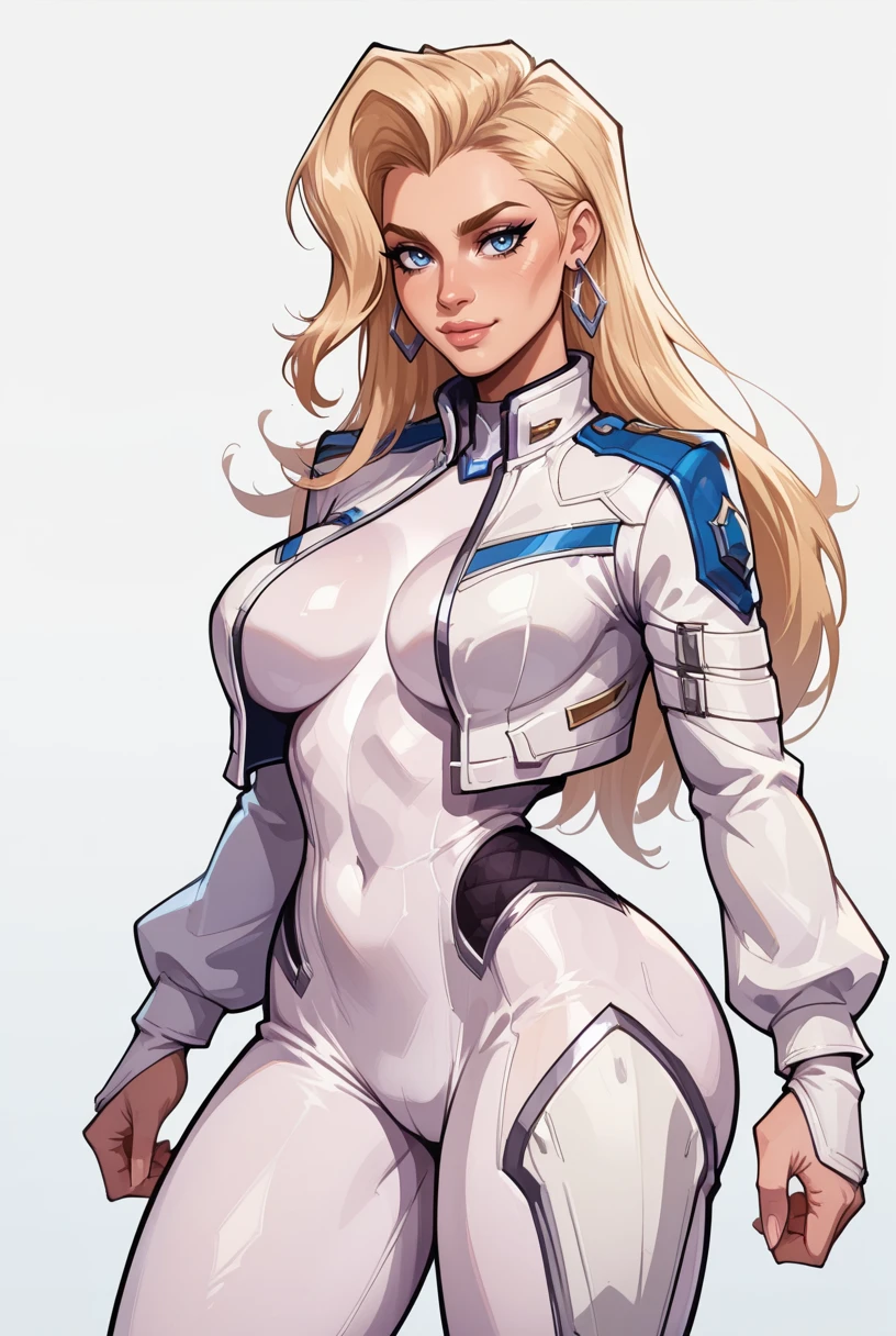 long hair, blonde hair, jewelry, earrings, blue eyes, white bodysuit, cropped jacket