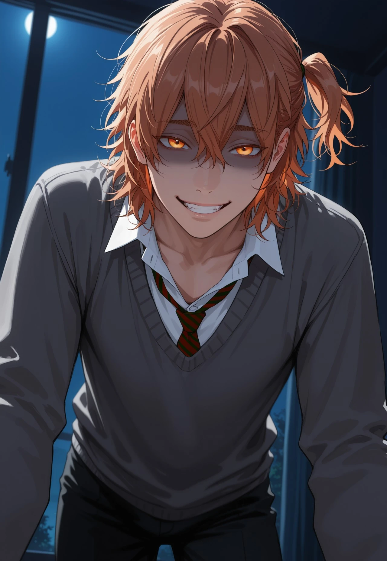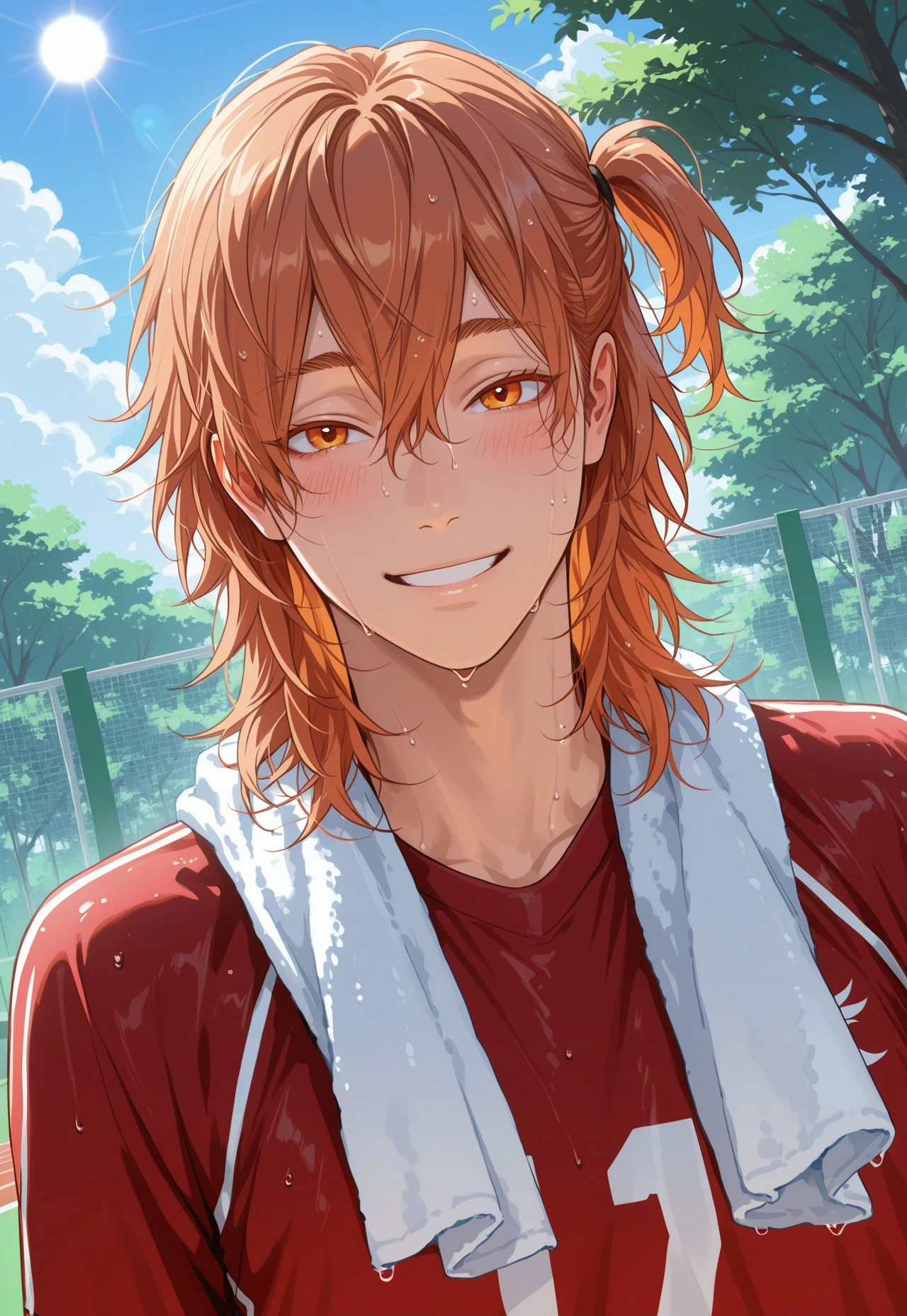 YBCYagushi, 1boy, orange hair, medium hair, hair between eyes, one side up, thick eyebrows, orange eyes, colored eyelashes,