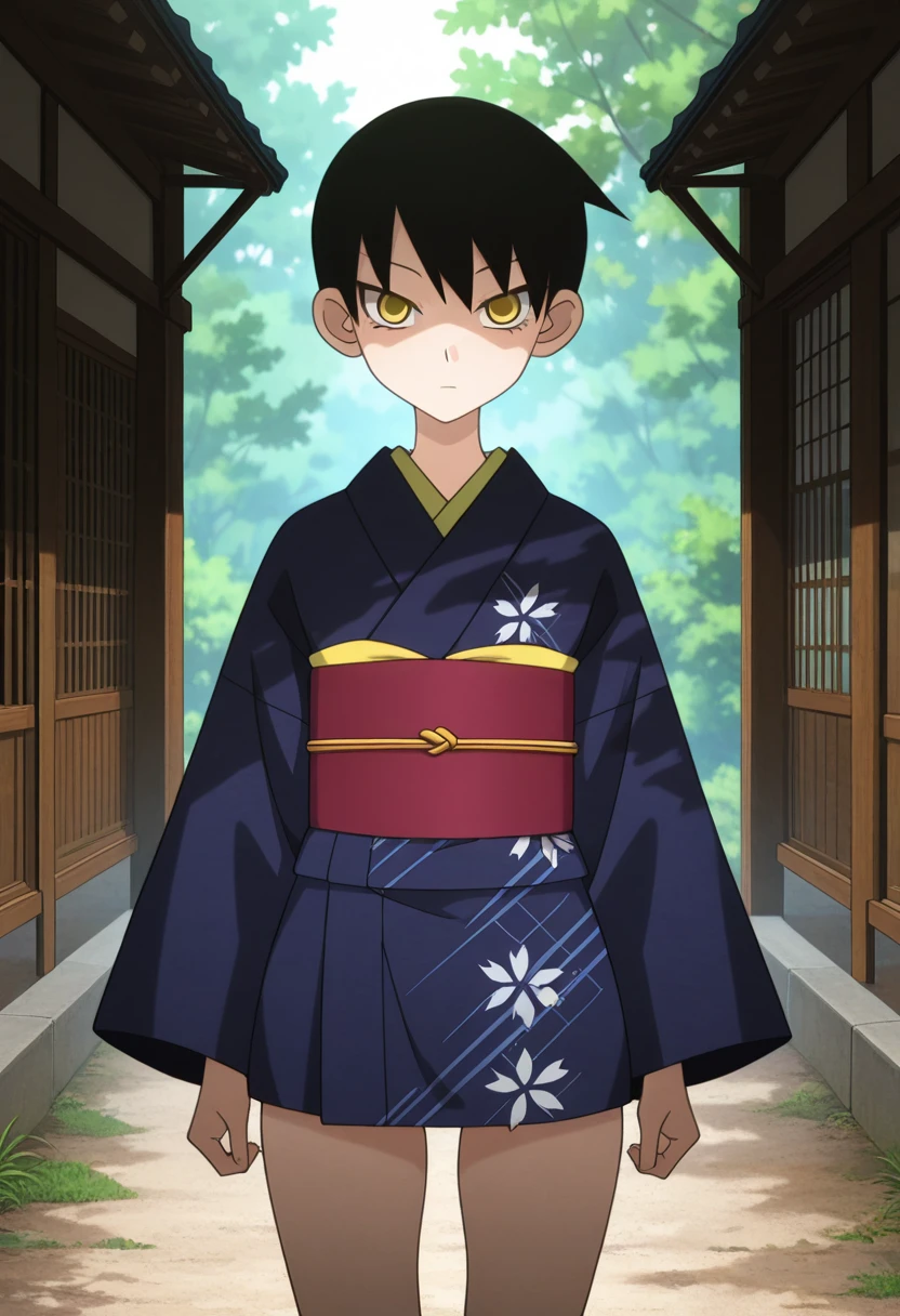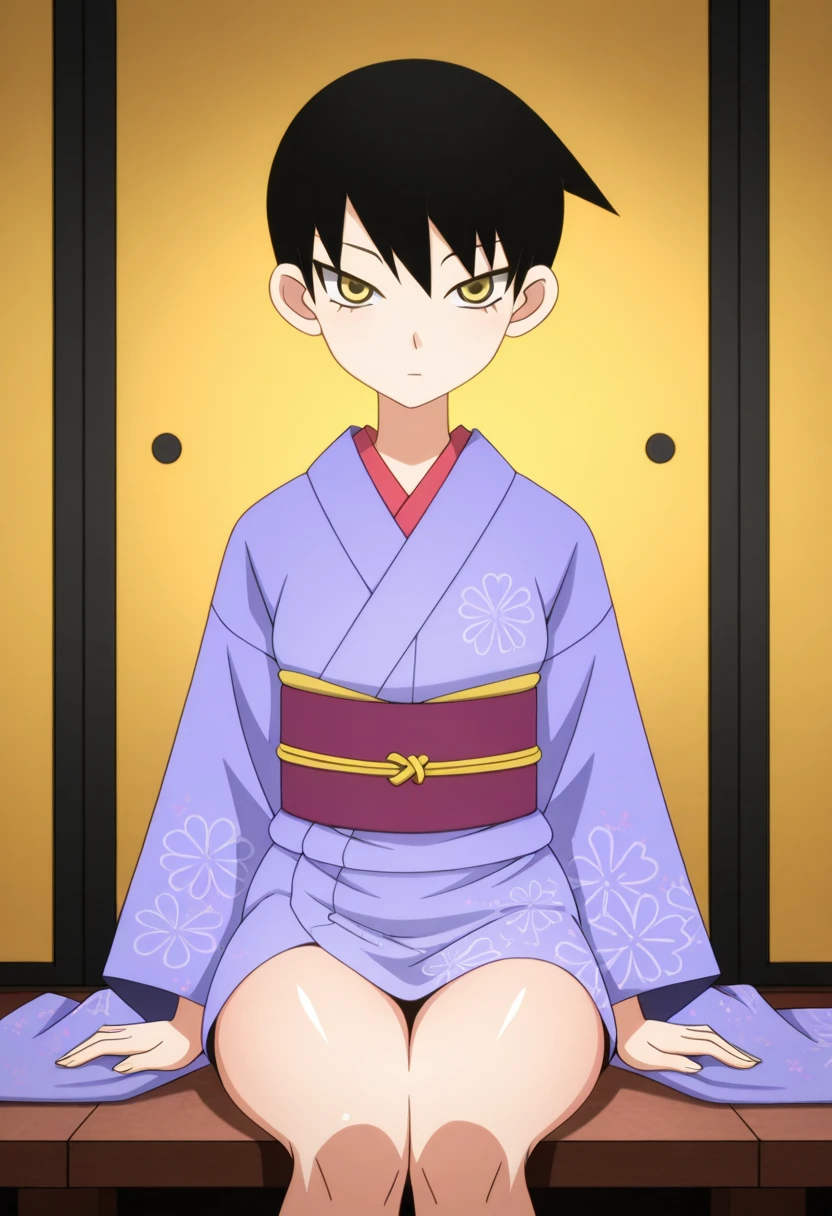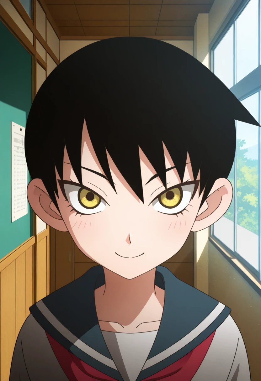 mayoww, yellow eyes, black hair, short hair, tsurime,