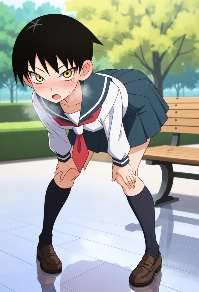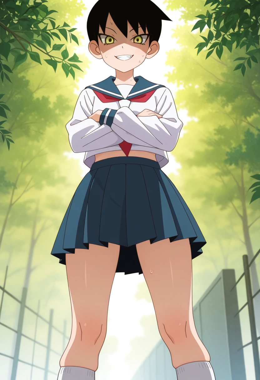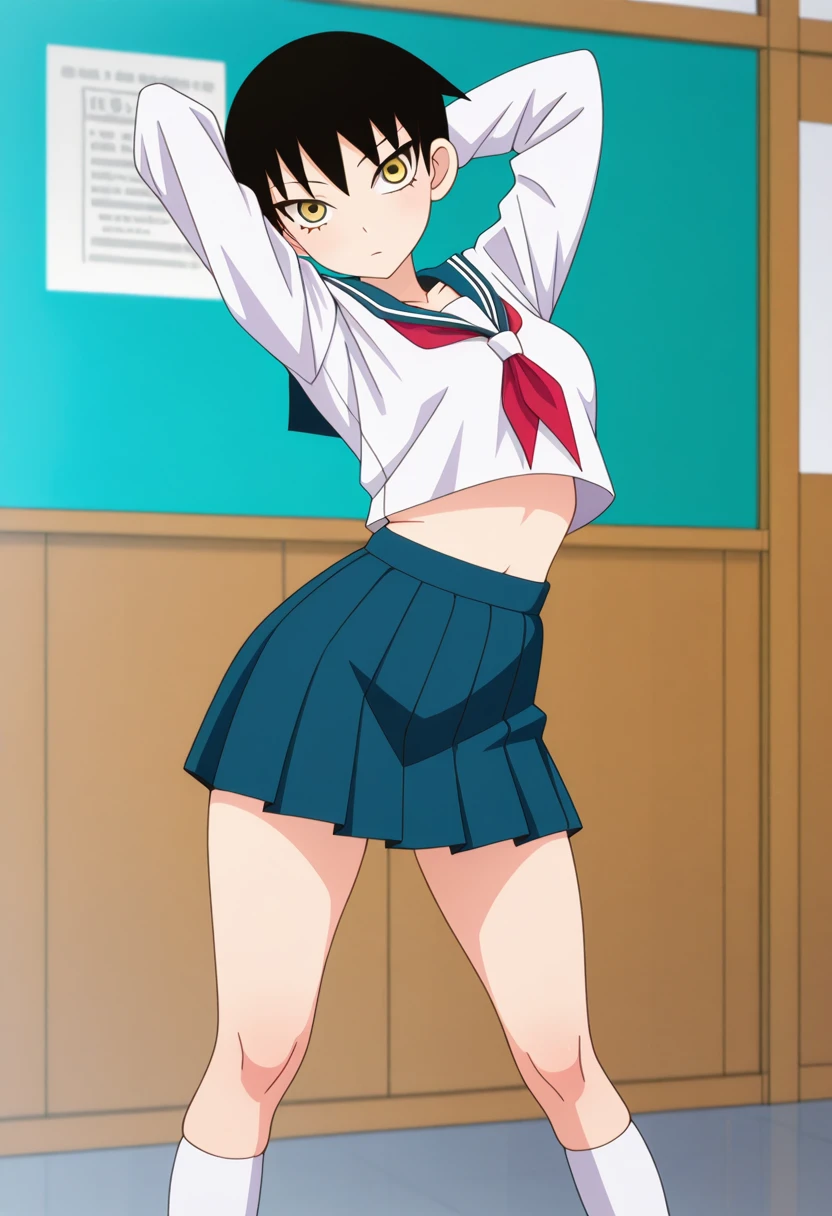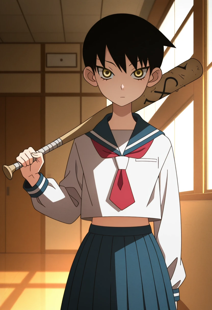 mayoww, yellow eyes, black hair, short hair, tsurime,