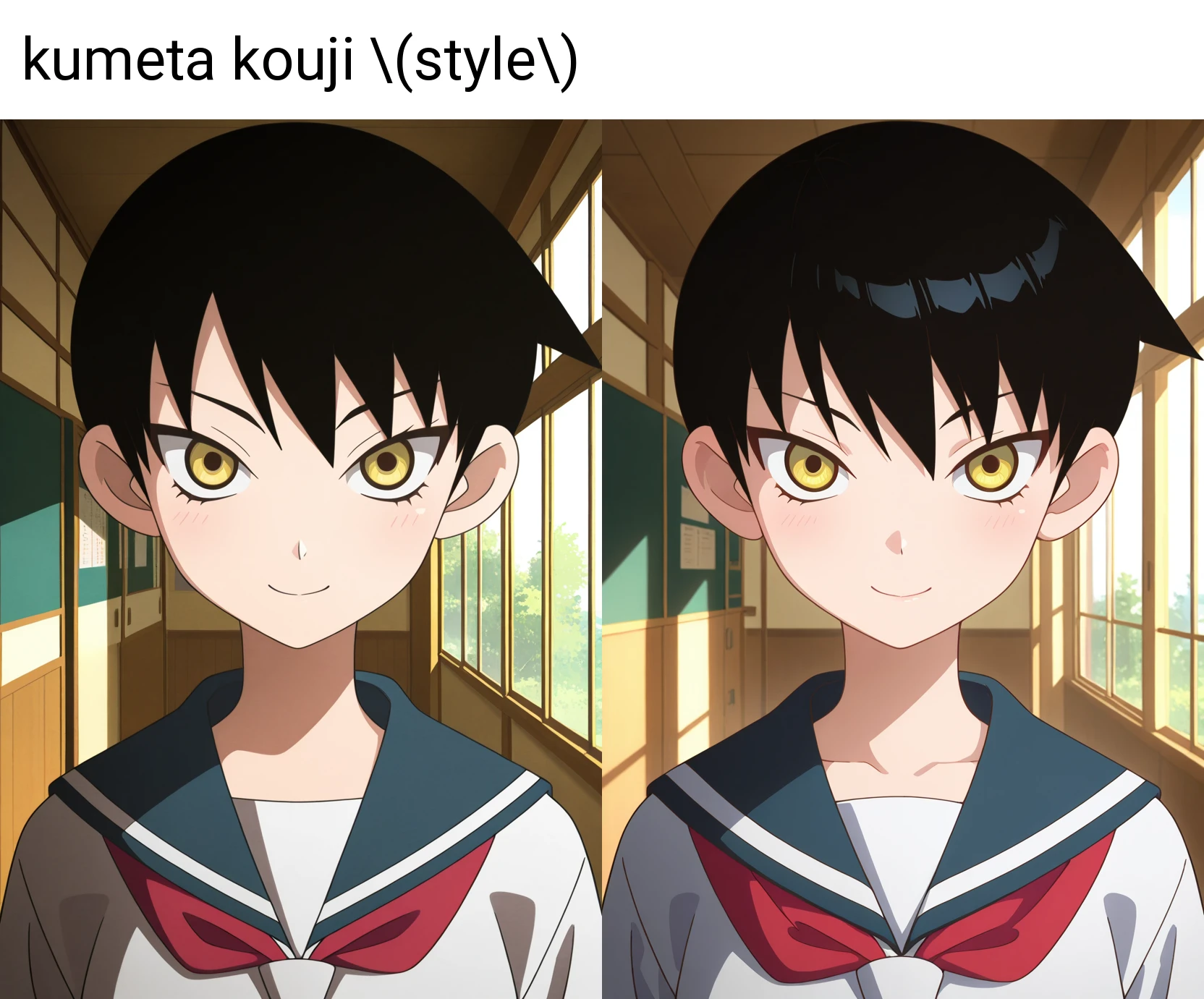 プロンプトに"kumeta kouji \(style\)"を追加する方が、再現度が高くなるようです。