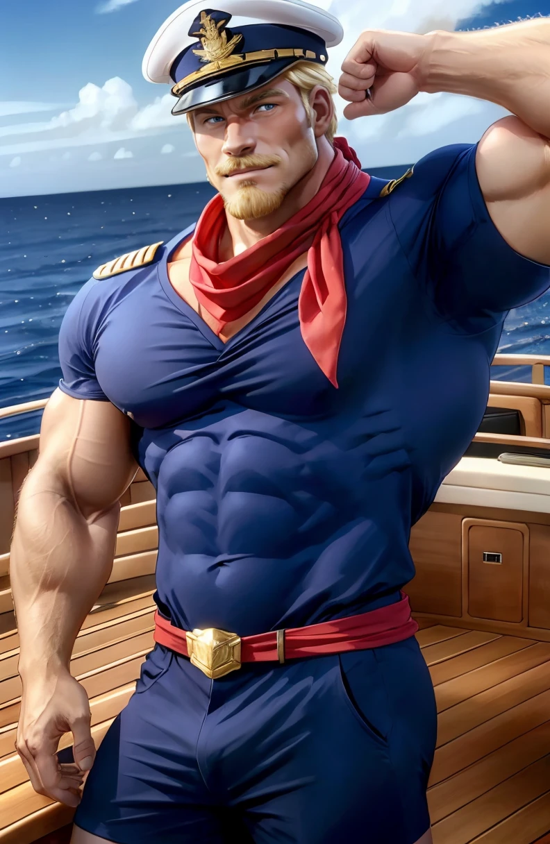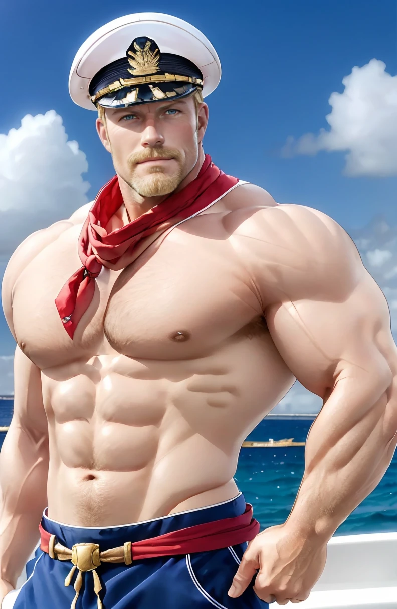 Clothing: Iconic look (blue shirt, captain's hat, and red neckerchief)