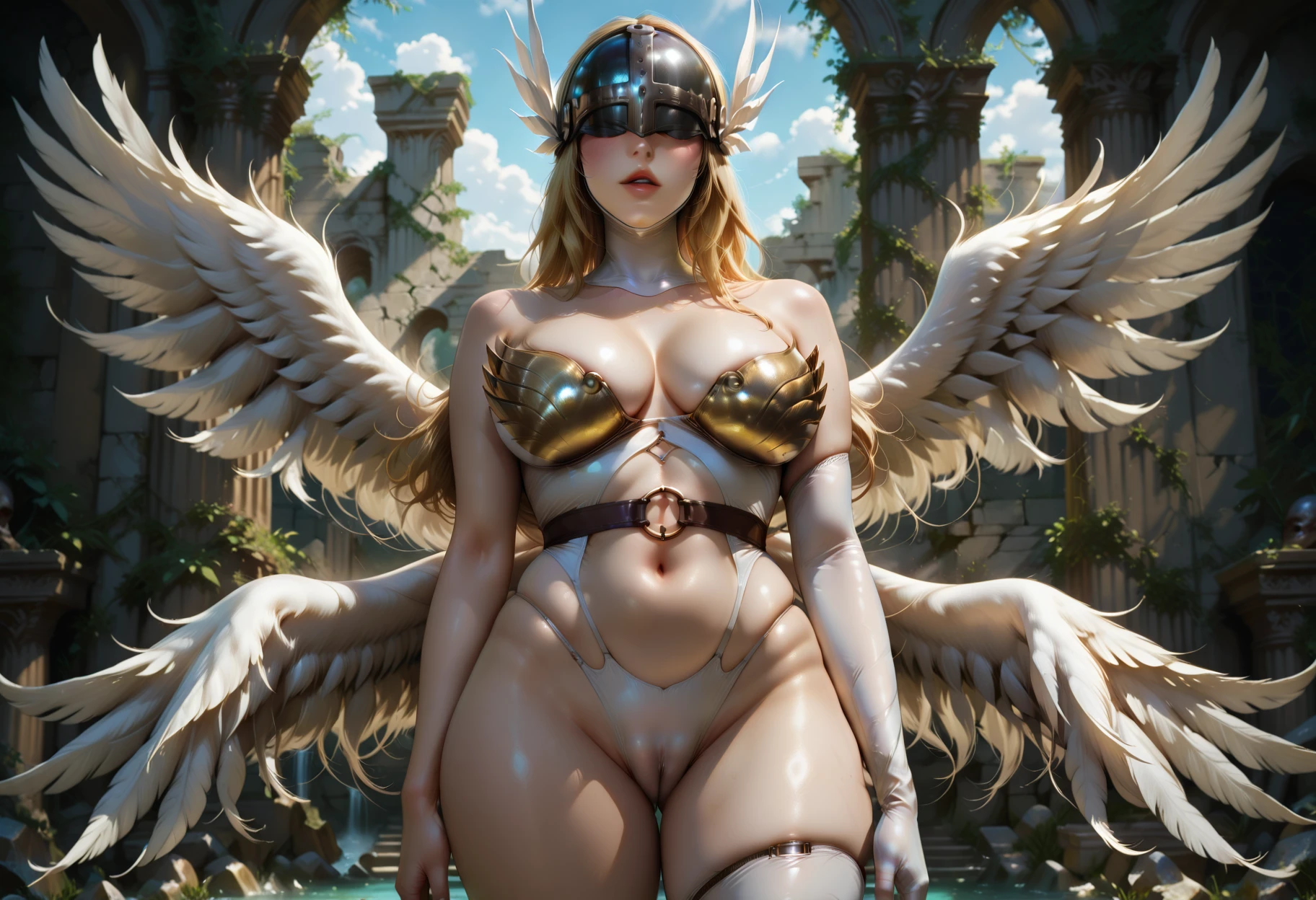 masterpiece, best quality, 1girl, angewomon, breasts, solo, large breasts, bare shoulders, parted lips, cameltoe, thighs, covered eyes, helmet, multi wings, white feather wings, standing, Greek ruins, upper body, high heel, single high thighs, <lora:illustrious-angewomon 04 1216x1216-000010:1>,