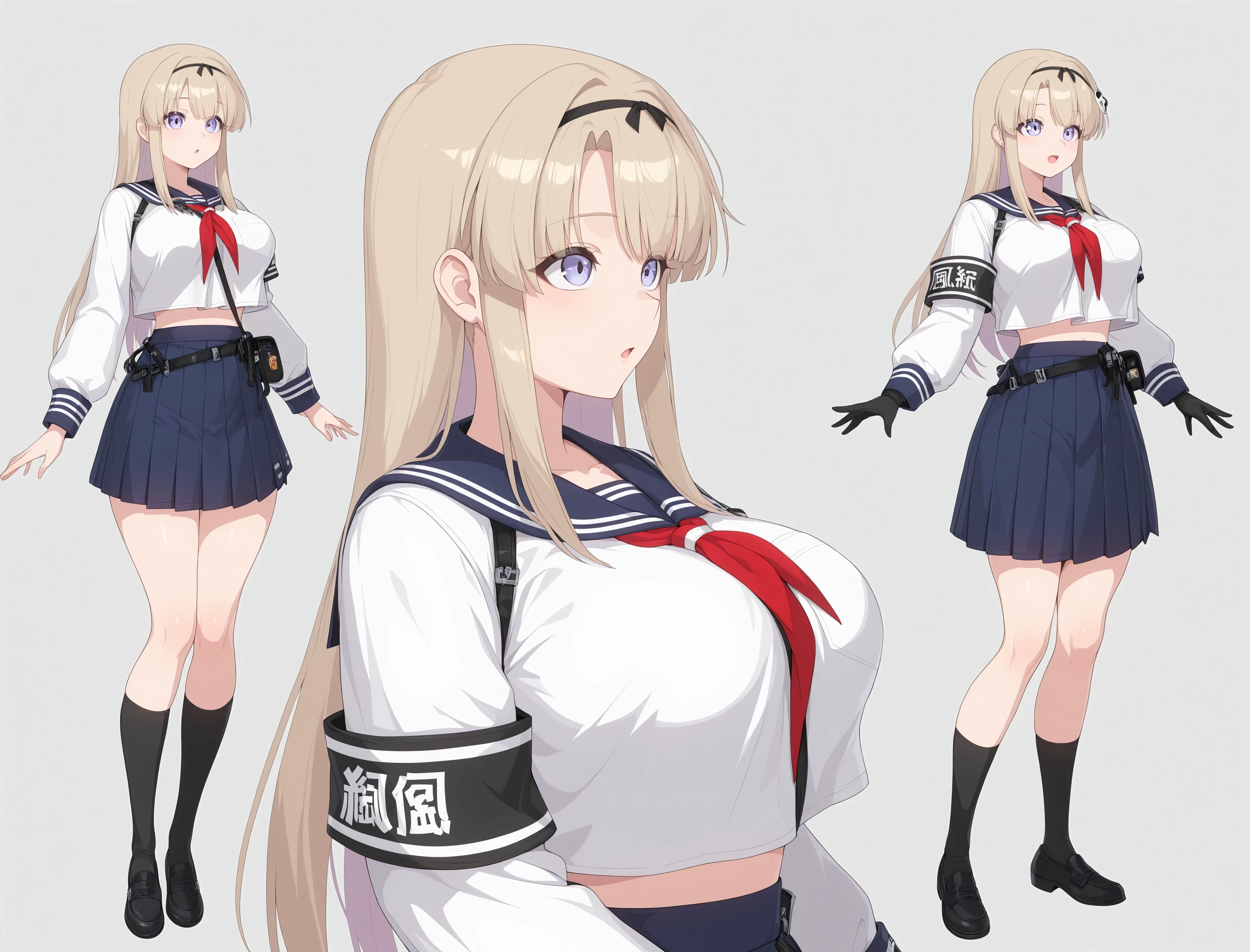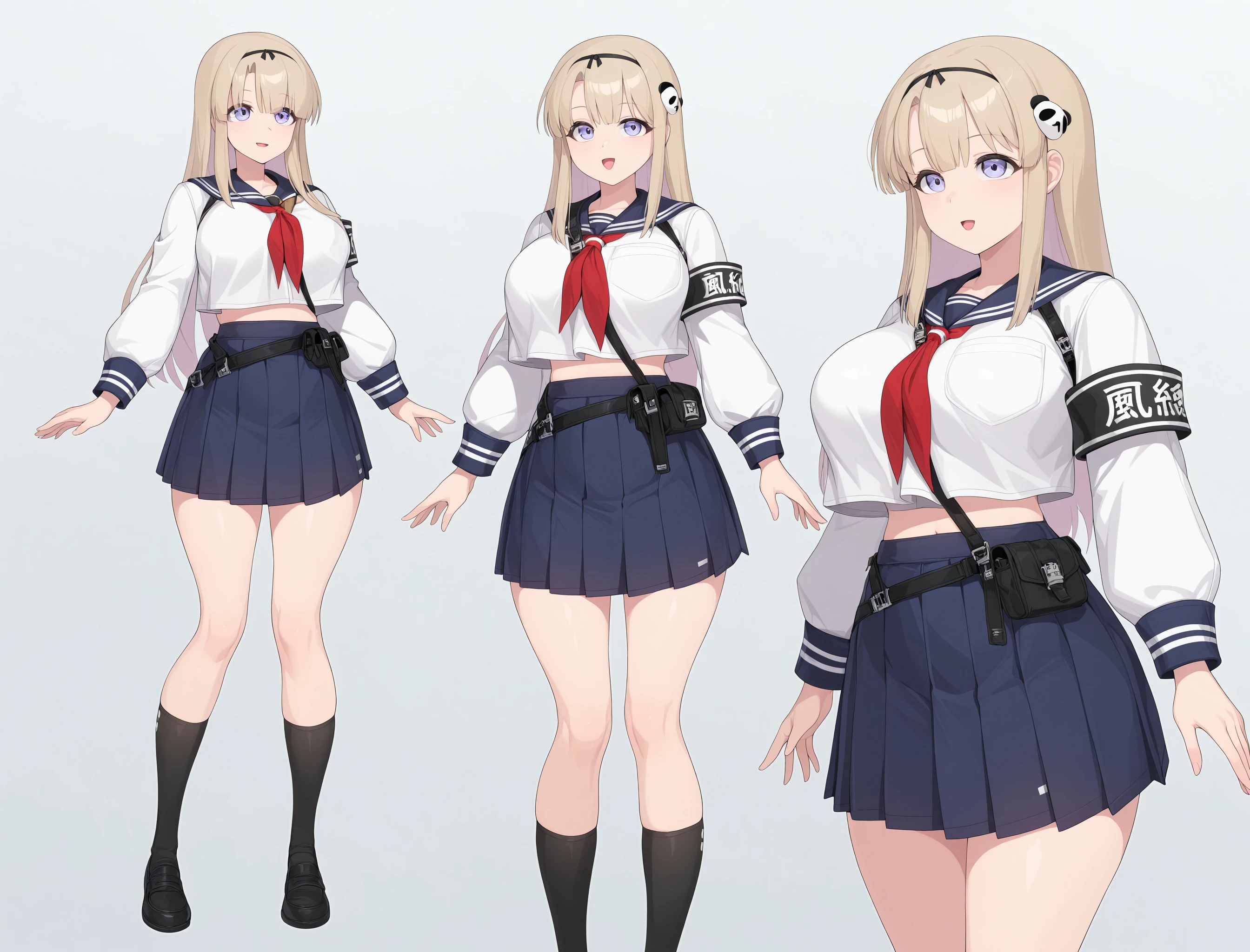 Haru,Chaos_Zero_Nightmare, panda acessory, long hair, gloves, 1girl, sailor collar, neckerchief, ???????????, bangs, blue skirt, pleated skirt,blue eyes,navy school outfit ,blonde hair, black socks, black school shoes, blue eyesDescription
