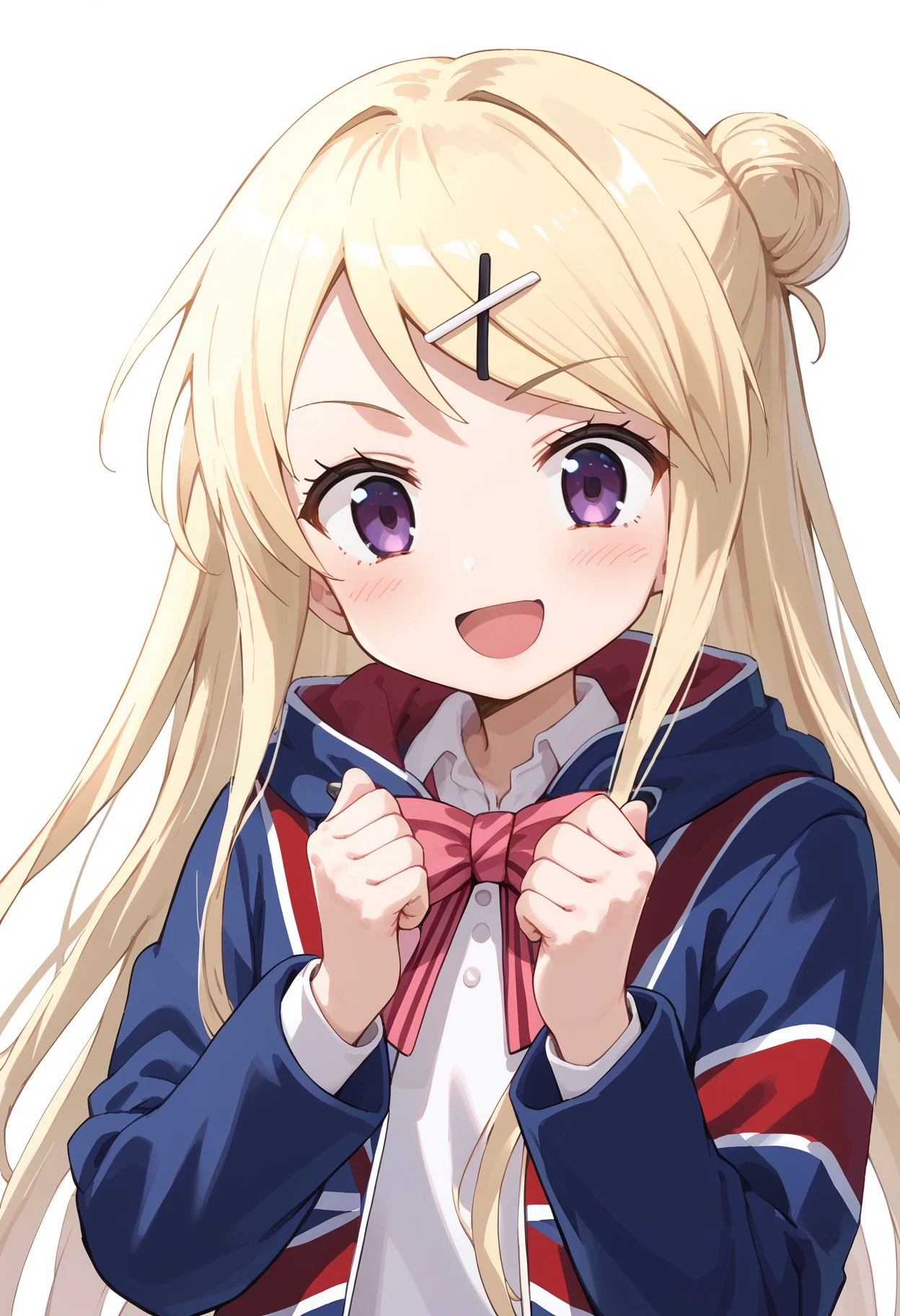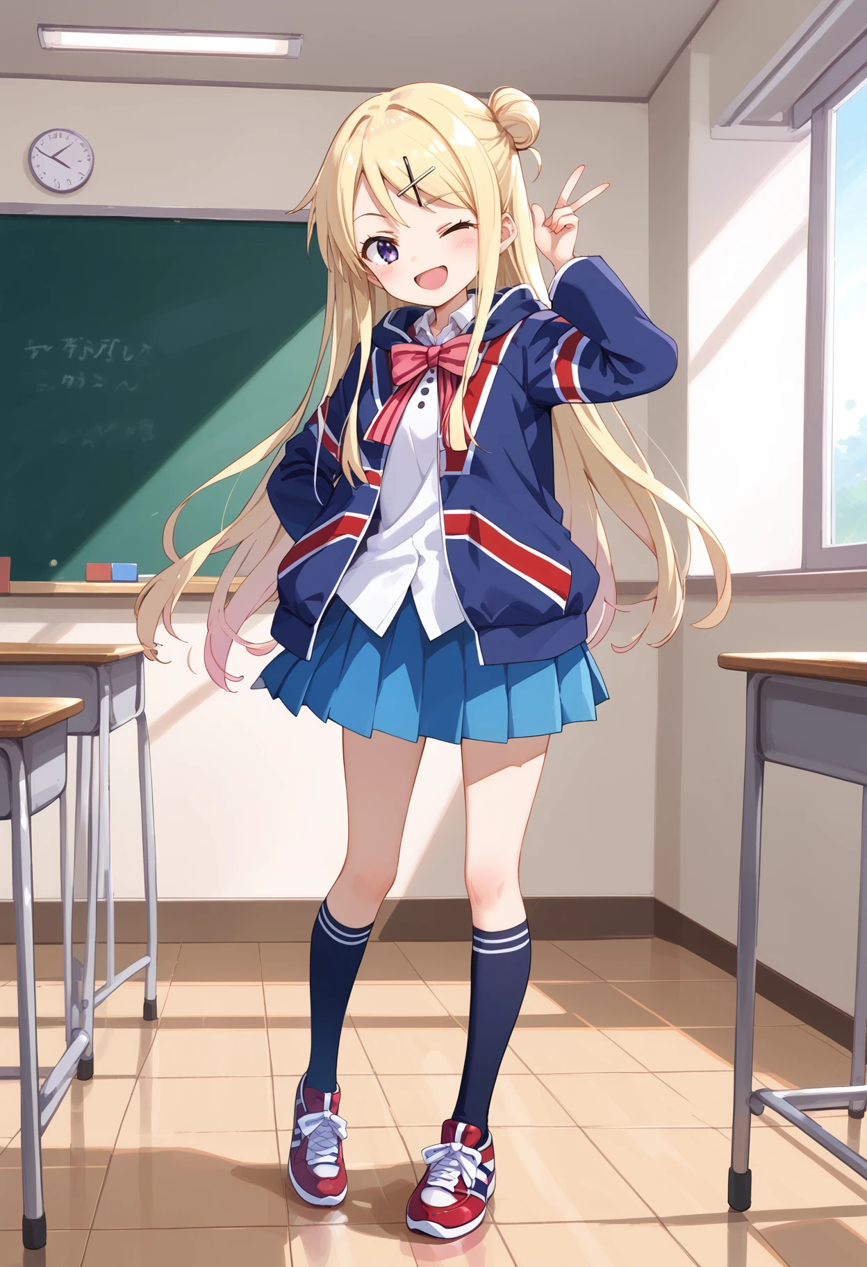 union jack jacket, striped bow, white shirt, long sleeves, pleated skirt, blue skirt, kneehighs, sneakers