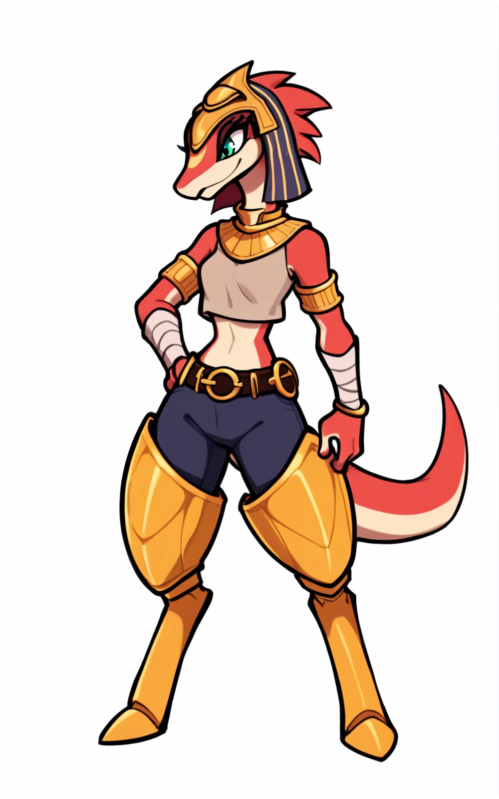 Reinforcement Tags: red skin, red hair, egyptian, headwear, scalie, furry, furry female, tail, lizard tail, egyptian clothes
