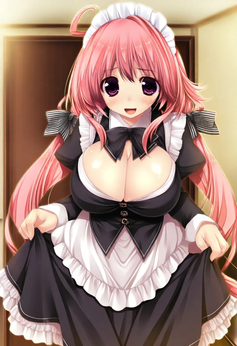 Nazuna Komachiya, purple eyes, pink hair, long hair, ahoge, low twintails, hair ribbon,