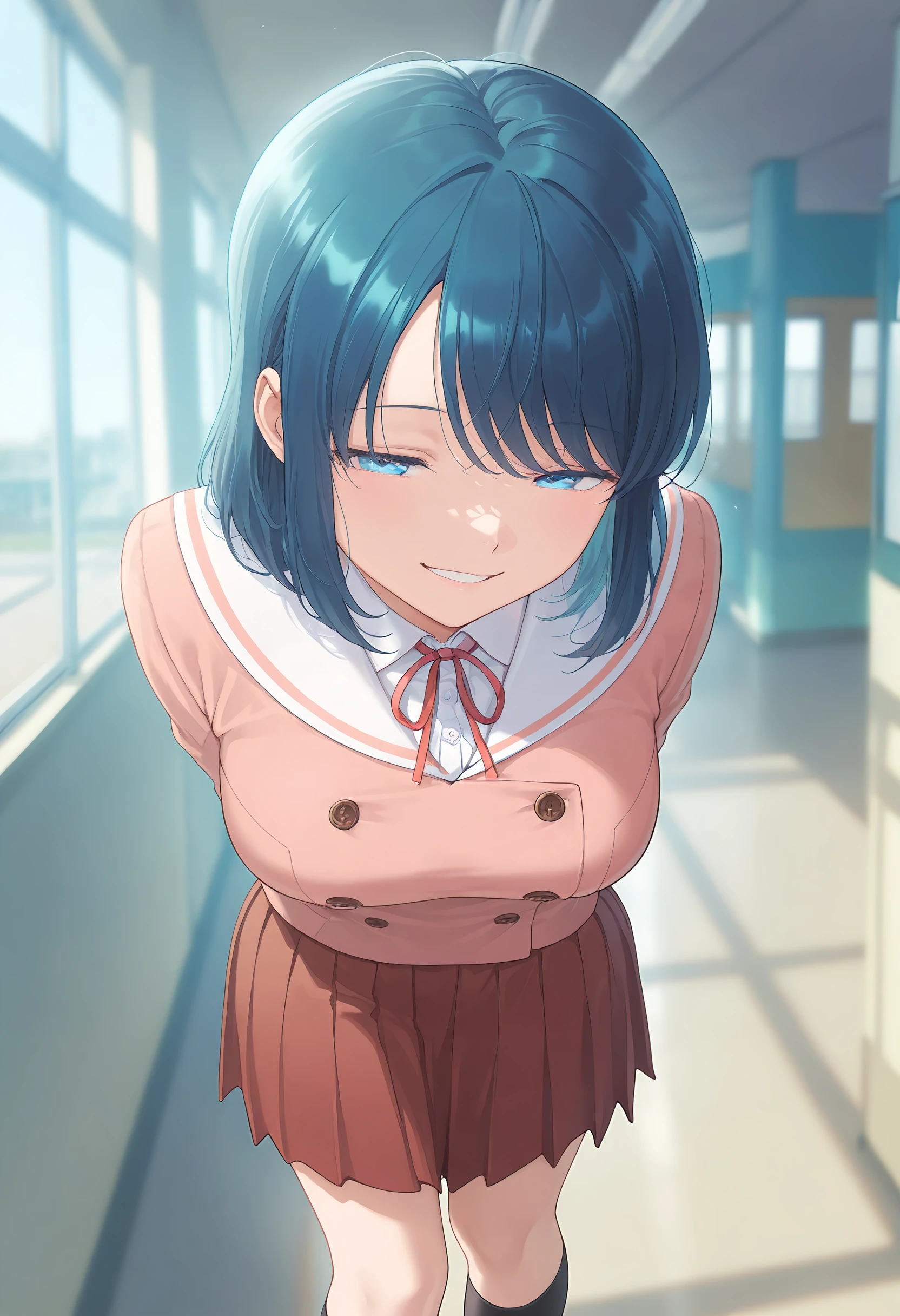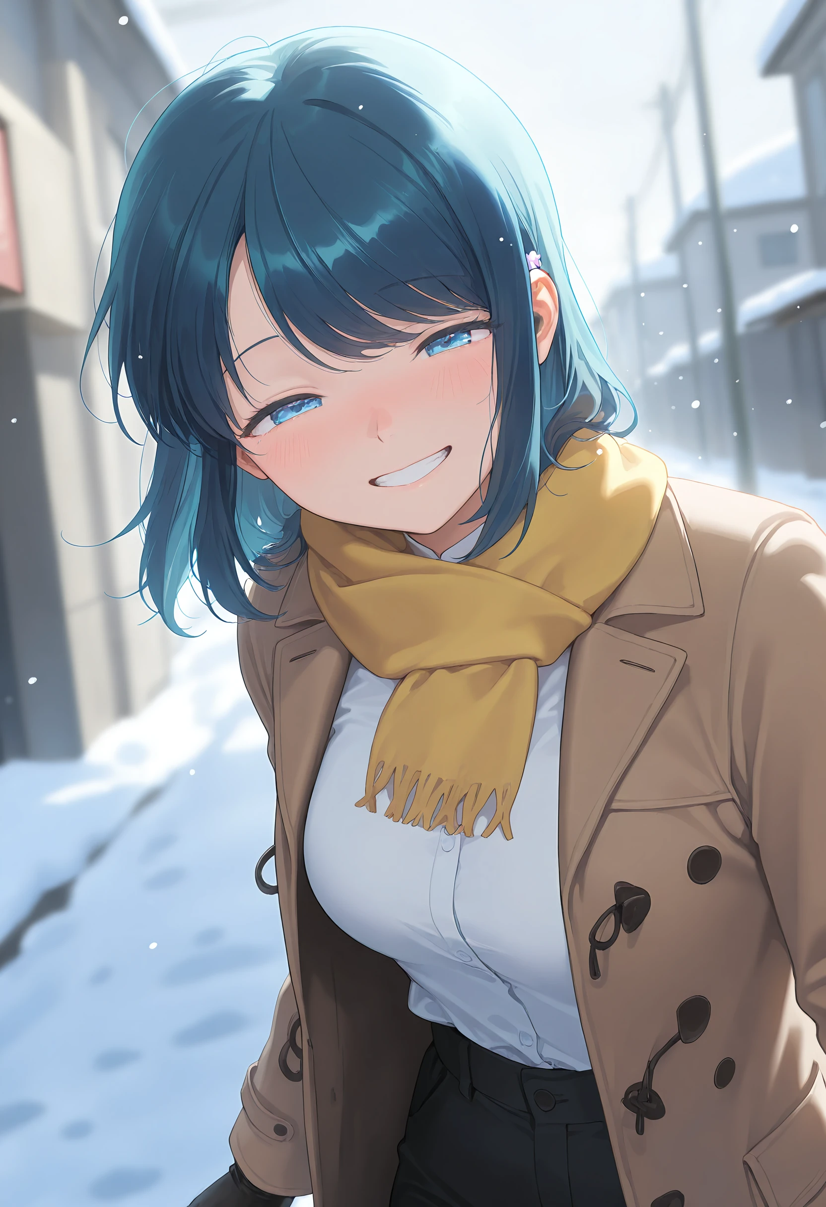 Tags for her look: 1girl, solo, medium breasts, medium hair, blue eyes, blue hair, swept bangs,